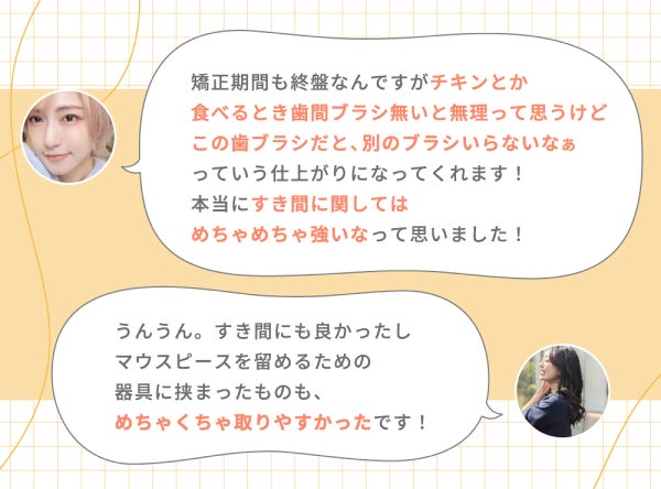 ワイヤー矯正中だけでなく、もちろんマウスピース矯正中の方の"すき間"の詰まりにも◎ オーラルケアに気を遣っている、矯正中の方にぴったりな歯ブラシですよね! 今まで色々なアイテムでケアを頑張っていた方も、「これ1本できれいに磨けた」と感動の声があがりました。