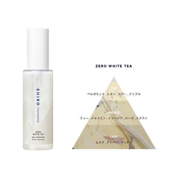 「ゼロホワイトティー」はリフレッシングなシトラスと落ち着きのあるティーが香るリニューアル前の「ホワイトティー」に、フレッシュな果実を思わせる「サボン」、 フルーティーな「ペアー」、そして透明感のあるフルーティーフローラルな「FREESIA MIST」の香りから誕生。