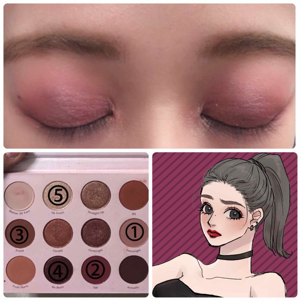 パレットビンゴday6でっす横列中段はミディアムブラウンFrank、コッパーCandid、ラメ入りローズメタリックForthright、ダスティピンクのDownrightですまずマット2色を上瞼に塗りましたDownrightを目頭側半分、Fr...