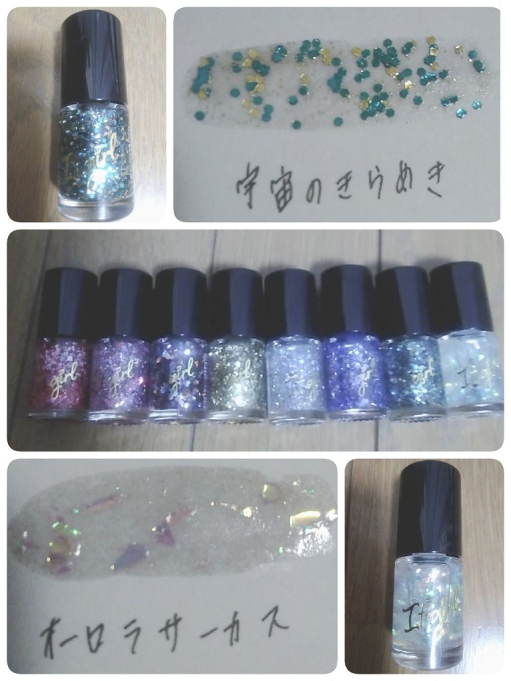 ダイソー購入品Itgirlグリッターネイル全8種左上から➡︎1恋のメロディ2射止めてハート3真夜中のミラーボール4お目立ちさん左下➡︎5星空パーティー6海に抱かれて7宇宙のきらめき8オーロラサーカスラメ、ホロ、グリッターでどの色もキラキラでか...