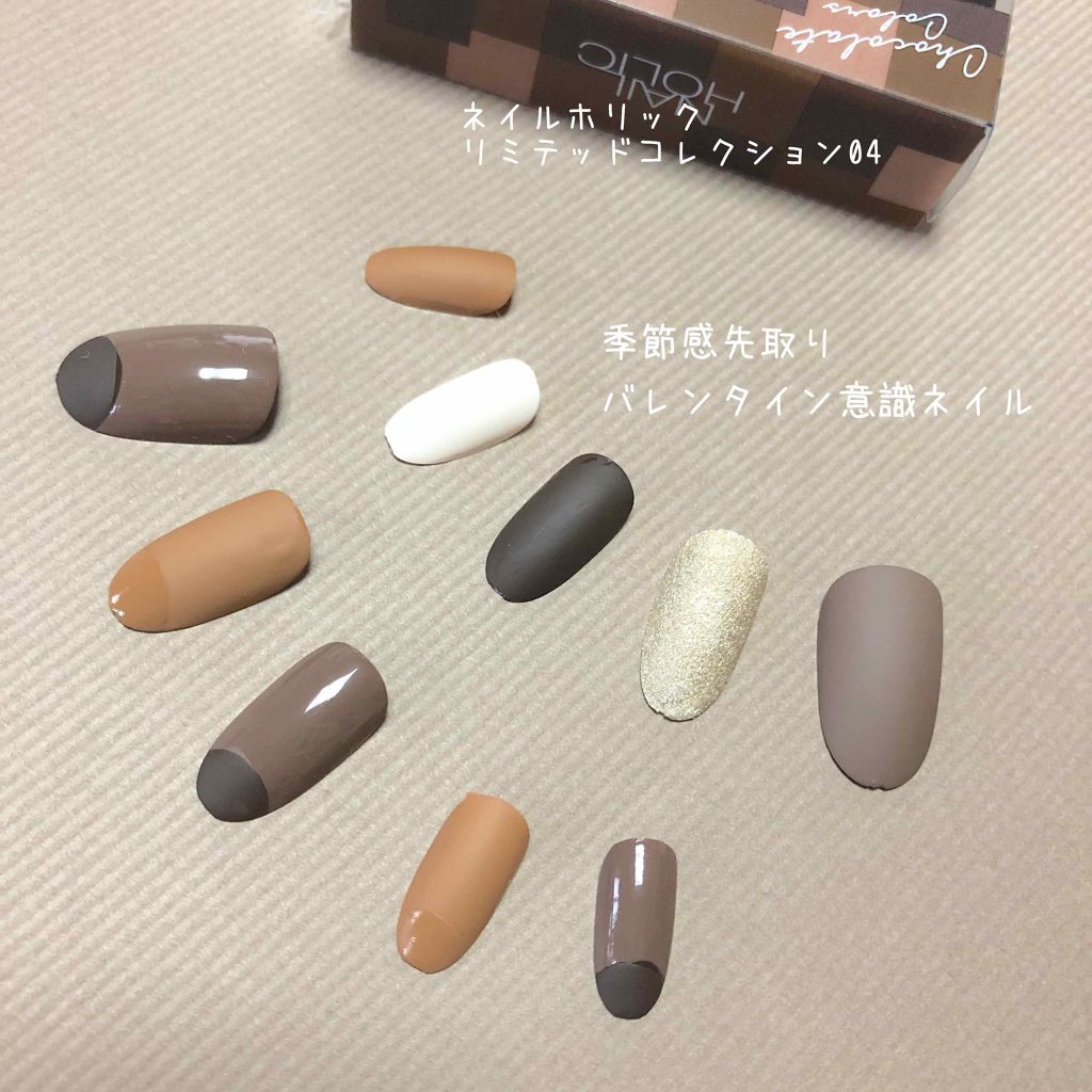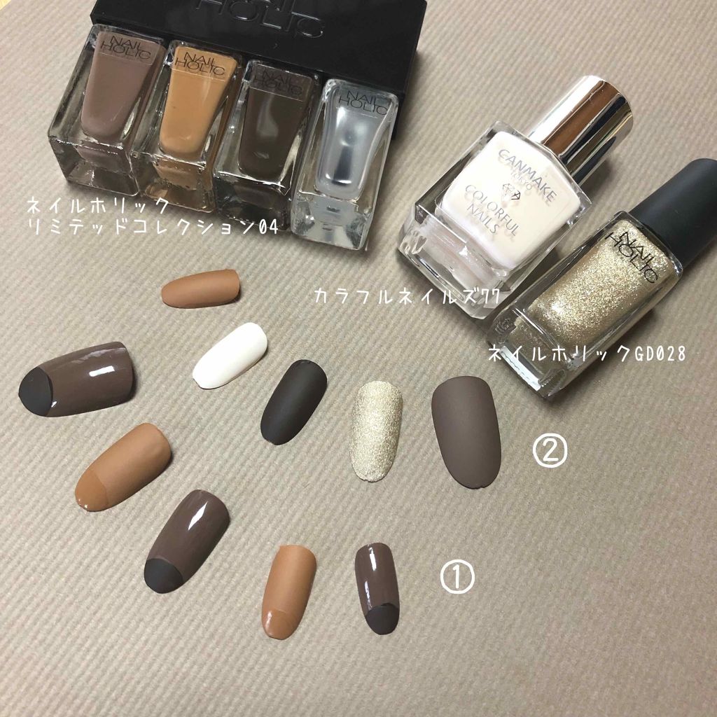ネイルホリックのビスケットがモチーフのネイルです♡ 11月16日に発売されたばかりのカラーで、限定品となっています。特徴としてはざくざくとしたビスケットのような質感を簡単に出せるというところ。 しっかり濃い目のダークブラウン。ビターチョコレートのような色味で寒い季節にぴったり。濃いブラウンはブラウンでも美味しそうな色味なので、かっこよくなりすぎず、ほんのり甘い雰囲気を感じました。 柔らかなアイボリーにクッキーカラーのつぶつぶ。マット+白っぽいお色は浮くかな?と思いましたが、真っ白すぎないほんのり黄みのあるアイボリーカラーで肌馴染みが良いです。