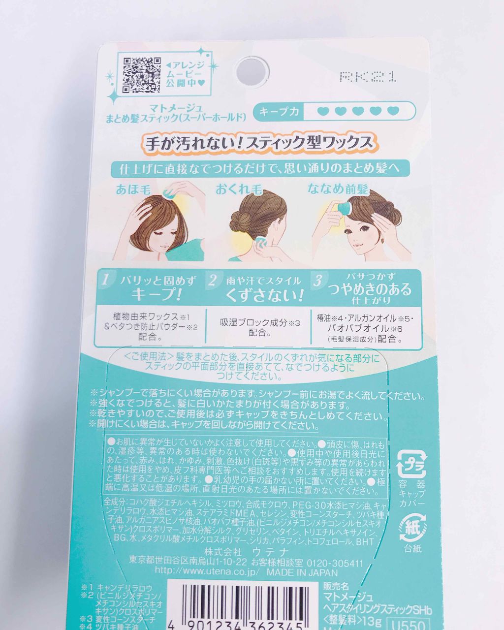 みんながおすすめしていたウテナ マトメージュまとめ髪スティックスーパーホールド 使ってみました!アホ毛にはとても使いやすいです👏バリバリしないところもいい点◎わたしとしては後れ毛や前髪はマスカラタイプの方が使いこなせるなという印象でした!なの...
