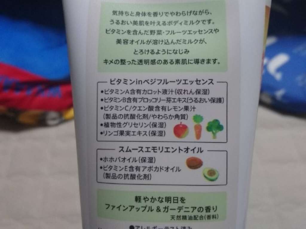 - ●心地よい香りに包まれながら、うるおい美肌を叶えるボディミルクです ●野菜・フルーツエッセンスや美容オイルが溶け込んだミルクが、とろけるようになじみキメの整った透明感のある素肌に導きます ●ベジフルーツエッセンス*1配合 ●スムースエモリエントオイル*2配合 ●ファインアップル&ガーデニアの香り ●天然精油配合(香料) *1:カロット液汁(収れん保湿)、ブロッコリー芽エキス(うるおい保護)、レモン果汁(製品の抗酸化剤/やわらか角質)、植物性グリセリン(保湿)、イザヨイバラエキス(保湿) *2:ホホバオイル(保湿)、アボカドオイル(製品の抗酸化剤)