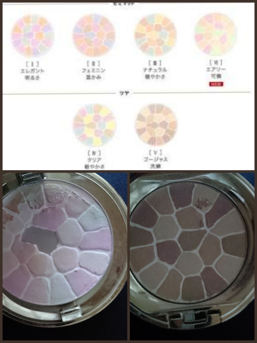 - <I エレガント> タルク、ナイロン-12、ジステアリン酸Al、スクワラン、(ジヒドロキシメチルシリルプロポキシ)ヒドロキシプロピル加水分解シルク、アルテア根エキス、アルニカ花エキス、ガマ穂エキス、グリチルリチン酸2K、パール、BG、メチコン、水、水酸化Al、フェノキシエタノール、プロピルパラベン、メチルパラベン、香料、グンジョウ、マイカ、酸化チタン、酸化鉄、硫酸Ba、赤226 <II フェミニン> タルク、ナイロン-12、ジステアリン酸Al、スクワラン、(ジヒドロキシメチルシリルプロポキシ)ヒドロキシプロピル加水分解シルク、アルテア根エキス、アルニカ花エキス、ガマ穂エキス、グリチルリチン酸2K、パール、BG、メチコン、水、水酸化Al、フェノキシエタノール、プロピルパラベン、メチルパラベン、香料、グンジョウ、マイカ、酸化チタン、酸化鉄、硫酸Ba、赤226 <III ナチュラル> タルク、ナイロン-12、ジステアリン酸Al、スクワラン、(ジヒドロキシメチルシリルプロポキシ)ヒドロキシプロピル加水分解シルク、アルテア根エキス、アルニカ花エキス、ガマ穂エキス、グリチルリチン酸2K、パール、BG、メチコン、水、水酸化Al、フェノキシエタノール、プロピルパラベン、メチルパラベン、香料、グンジョウ、マイカ、酸化チタン、酸化鉄、硫酸Ba、黄4、赤226 <IV クリア> タルク、ナイロン-12、ジステアリン酸Al、スクワラン、(ジヒドロキシメチルシリルプロポキシ)ヒドロキシプロピル加水分解シルク、アルテア根エキス、アルニカ花エキス、ガマ穂エキス、グリチルリチン酸2K、パール、BG、メチコン、水、プロピルパラベン、メチルパラベン、香料、(+/-)、グンジョウ、マイカ、酸化チタン、酸化鉄、水酸化Al、硫酸Ba、黄4、赤226 <V ゴージャス> タルク、ナイロン-12、ジステアリン酸Al、スクワラン、(ジヒドロキシメチルシリルプロポキシ)ヒドロキシプロピル加水分解シルク、アルテア根エキス、アルニカ花エキス、ガマ穂エキス、グリチルリチン酸2K、パール、BG、メチコン、水、プロピルパラベン、メチルパラベン、香料、(+/-)、マイカ、酸化チタン、酸化鉄、水酸化Al <VI エアリー> タルク、ナイロン-12、ジステアリン酸Al、スクワラン、(ジヒドロキシメチルシリルプロポキシ)ヒドロキシプロピル加水分解シルク、アルテア根エキス、アルニカ花エキス、ガマ穂エキス、グリチルリチン酸2K、パール、BG、メチコン、水、フェノキシエタノール、プロピルパラベン、メチルパラベン、香料、グンジョウ、マイカ、酸化チタン、酸化鉄、水酸化Al、硫酸Ba、赤226
