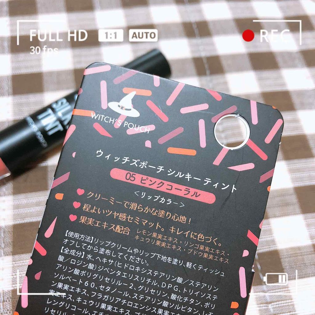 💗カラー長持ち💗100%おすすめ💗ウィッチズポーチSILKYTINT🎩✨着け心地はクリーミーでセミマット仕上げになってます!購入したのはピンクコーラル。私は唇が弱く、グロスやティントを付けるとふにゃふにゃボロボロになってしまうのでこのSILK...