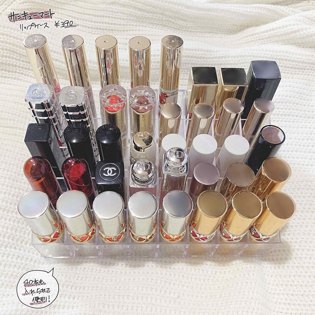 ダイソーにはこれ以外にもリップ収納にぴったりな収納ケースが売ってるんだけど、このケースの魅力は収納力&フタ! ケース1つでリップが18本も入ります◎ こちらはメイクブラシを1本1本立てて収納することができるケースです✨ 斜めにした状態でキープすることができるので、ブラシが取り出しやすくとっても便利。 この収納ケースは大好きすぎて4つ持ってる😂 とにかくこのケースは収納力が抜群。 特に4色のアイパレの収納におすすめで、1つで30個ぐらいは入るから、息を吸うようにアイシャドウ買う私にはマストアイテム。