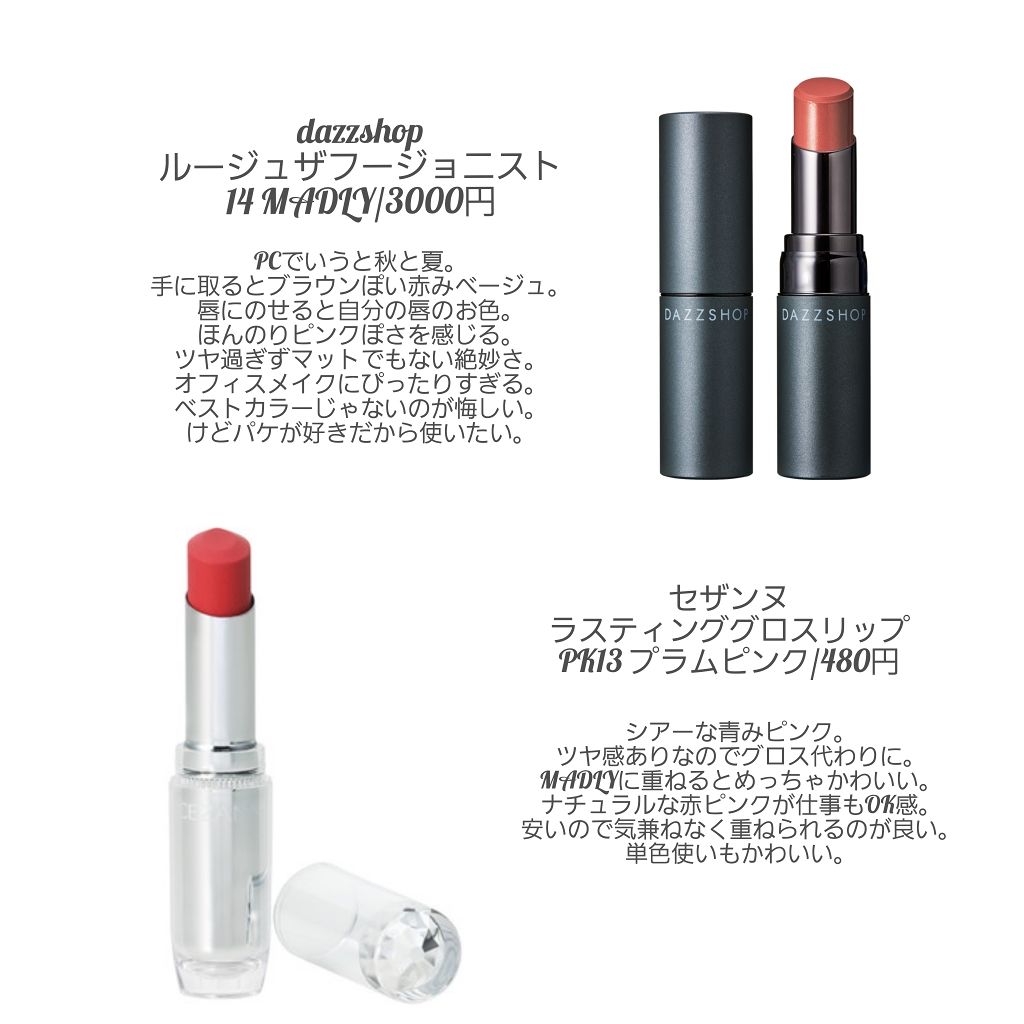 〜おすすめメイク〜今回はリップ紹介です。※画像でダズショップのリップの名前"ュ"入れ忘れてます。①ダズショップルージュザフュージョニスト14MADLYヌーディーレッドベージュ。手に取るとブラウンぽいけど唇にのせると自分の唇とほぼ同じ色でかわい...