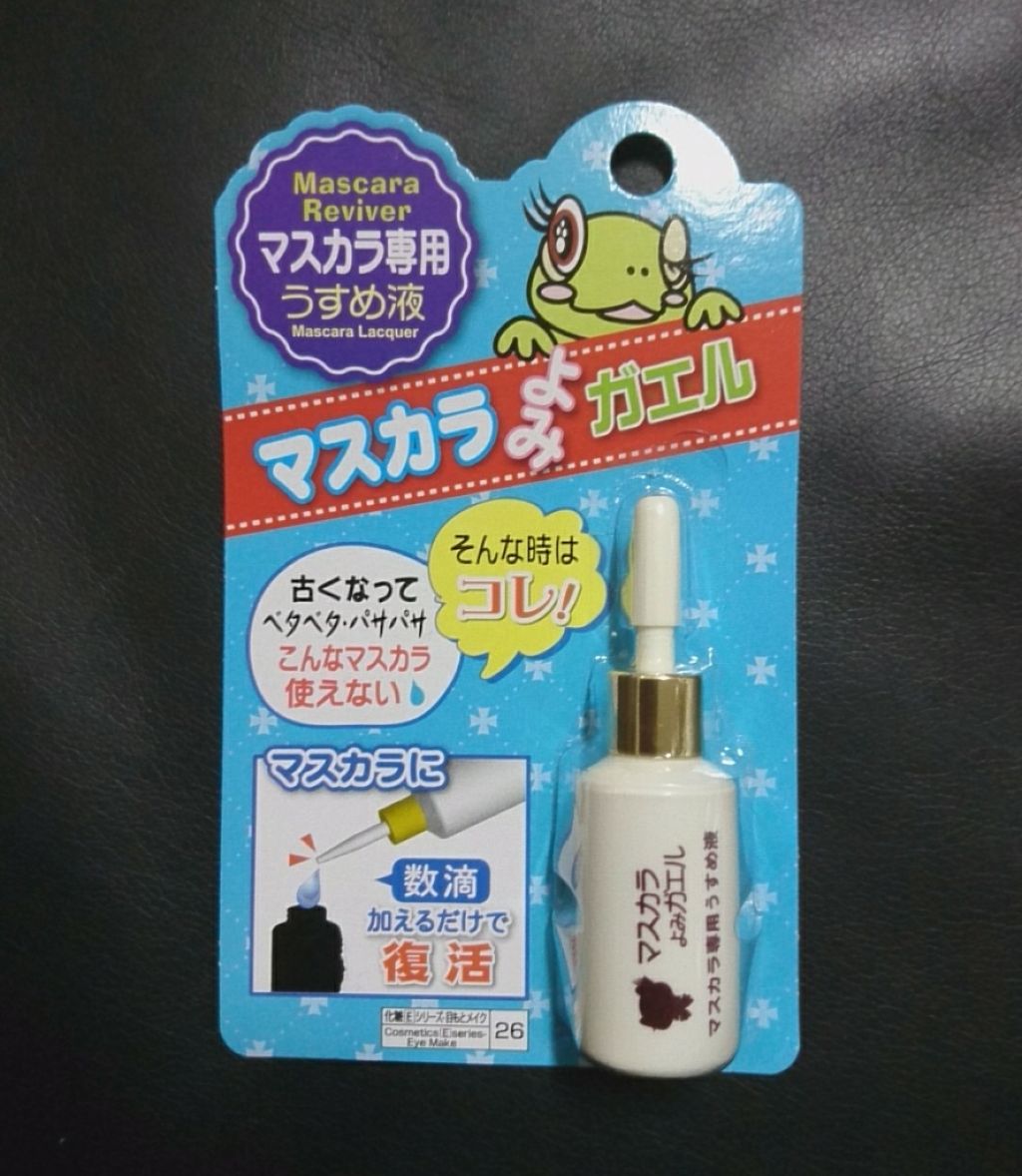 \\マスカラよみがえる、使ってみた!//DAISOさんに売っていたエルファーマスカラよみガエルというのを買って見ました😘¥110だし、試しにと思って購入〜乾燥しかけていたマスカラ(もうなくなりそうなやつ)に数滴垂らして混ぜてみたらちょっと復活...
