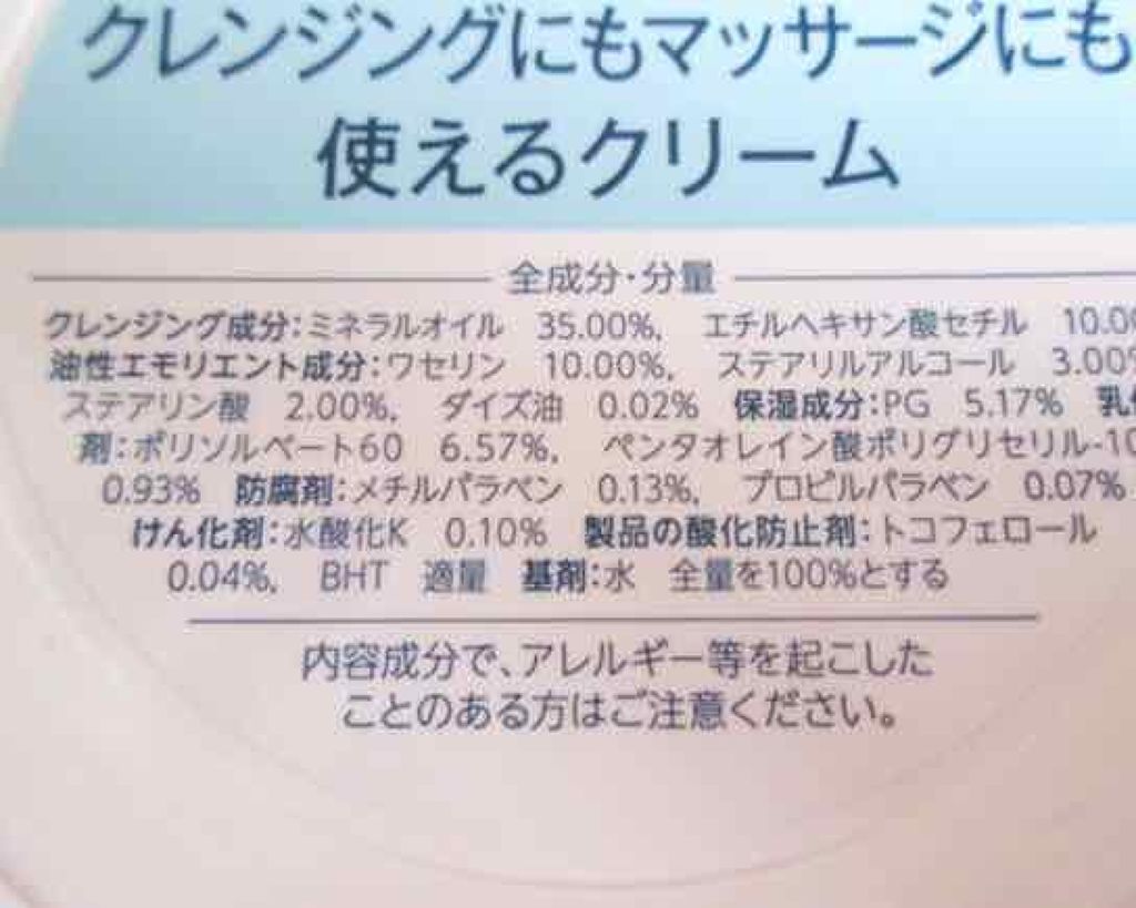 - クレンジング成分:ミネラルオイル 35.00% , エチルヘキサン酸セチル 10.00% 油性エモリエント成分:ワセリン 10.00%, ステアリルアルコール 3.00%, ステアリン酸 2.00% 保湿成分:PG 5.17% 乳化剤:ポリソルベート60 6.57%, ペンタオレイン酸ポリグリセリル-10 0.93% 防腐剤:メチルパラベン 適量, プロピルパラベン 適量 pH調整剤:水酸化K 適量 製品の酸化防止剤:トコフェロール 適量 成分の酸化防止剤:BHT 適量 基剤:水 全量を100%とする