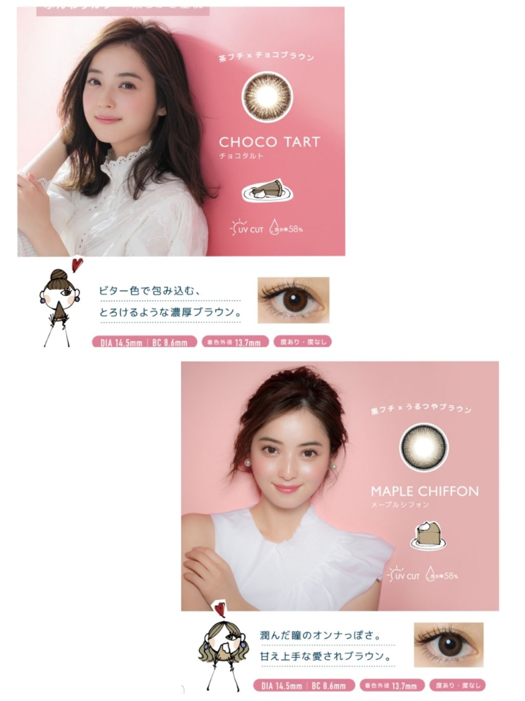 - ※2024年12月12日〜「シェルフラワームーン」「シェルチュールロゼ」のカラー名を、「フラワームーン」「チュールロゼ」へ順次変更。 ワンデータイプで度あり、度なしが揃っているカラーコンタクトということで使い勝手が良く、日々清潔なレンズを使用することが出来ますので、面倒なレンズの手入れ等も不要です。 ナチュラルなデザインに加え、瞳を大きく見せる事ができ、自然体でオトナ可愛い女性を演出してくれるでしょう。 ブランドコンセプトに合わせたカラーごとに異なるデザインで、さらにオトナ可愛い世界観を表現。 アートディレクターの三浦大知さんの書き下ろしイラストにもご注目ください。 カラーコンタクトレンズの不適正使用による眼障害の危険性等などがあります。 ●コンタクトレンズは高度管理医療機器です。不十分な洗浄・消毒など不適切なケアや、長時間・交換期間を超えた装用により、アレルギー性結膜炎、角膜感染症、角膜潰瘍等の重篤な眼障害が発生する危険性があります ●ご使用前に取扱説明書を確認してください 使用上の留意事項 ●眼科医院等を受診してからお求めください ●眼に異常を感じたら直ちにレンズ使用を中止し、お近くの眼科等で診察を受けてください ●医師の指示にしたがってご使用ください ●コンタクトレンズを装用する場合、自覚症状がなくても、眼科医院等での定期検査を受けてください ●レンズに不具合がある場合は使用しないでください