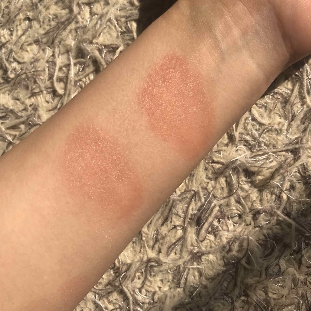 実際に使ってみると、想像していたより彩度があるな🤔🎨という感想。もう少しミルキーなものを想像していたんですが、アイシャドウカラーが綺麗にしっかり発色するので、1番淡いチークカラーをベースに塗って他の色を中間色や締め色にすると綺麗にグラデーションができました💁🏻♀️ よく見るとチークカラーに細かいパールが入っていて綺麗なツヤ感があるんですよ😭桃肌チーク…最高でした…。。。。 そしてなんといっても桃を連想させる綺麗なコーラルグリッター🍑💫とても肌馴染みの良い綺麗なベージュコーラルで軽くサッと塗っても綺麗に馴染んでくれるというか……迷ったらこれつけよう!と思えるカラーのグリッターでした。。。。 黄味の感じるコーラルピンクもあれば、ローズっぽいピンクもあるので、クールトーンでも比較的使いやすいのではないかという印象を受けました!