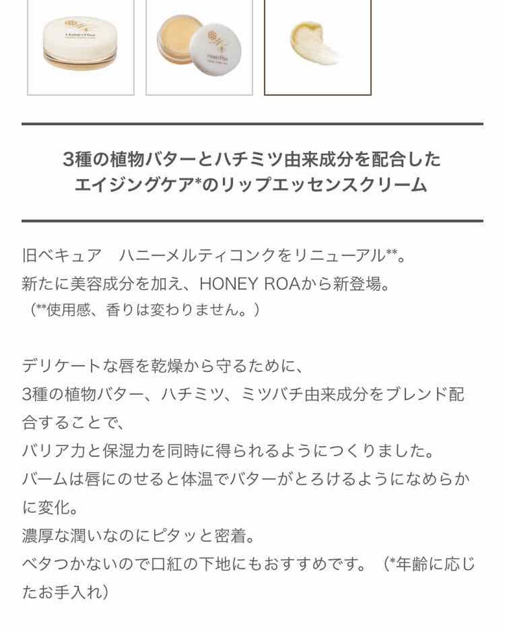 - 3種の植物バターとハチミツ由来成分を配合した エイジングケア*のリップエッセンスクリーム 旧ベキュア ハニーメルティコンクをリニューアル**。 新たに美容成分を加え、HONEY ROAから新登場。 (**使用感、香りは変わりません。) デリケートな唇を乾燥から守るために、 3種の植物バター、ハチミツ、ミツバチ由来成分をブレンド配合することで、 バリア力と保湿力を同時に得られるようにつくりました。 バームは唇にのせると体温でバターがとろけるようになめらかに変化。 濃厚な潤いなのにピタッと密着。 ベタつかないので口紅の下地にもおすすめです。(*年齢に応じたお手入れ) ●ほのかな蜂蜜の香り