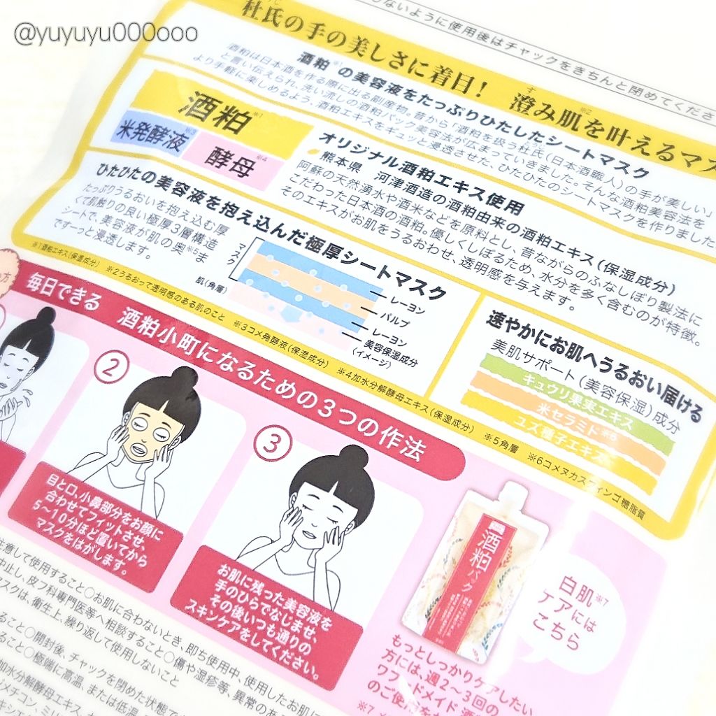 - <酒粕マスク> 水添レシチン、ジフェニルジメチコン、ユズ種子エキス、水添リゾレシチン、コメ発酵液、キュウリ果実エキス、フィチン酸、ラウリン酸ポリグリセリル-10、クエン酸Na、酸化銀、加水分解酵母エキス、ミリスチン酸ポリグリセリル-10、コメヌカスフィンゴ糖脂質、クエン酸、ヒドロキシエチルセルロース、加水分解コラーゲン、水、DPG、アルギニン、トリエチルヘキサノイン、グリチルリチン酸2K、エタノール、香料、フェノキシエタノール、水酸化K、カルボマー、加水分解ヒアルロン酸、酒粕エキス、グリセリン、BG、ペンチレングリコール <酒粕マスク【旧】> グリセリン、DPG、エタノール、酒粕エキス、コメ発酵液、加水分解酵母エキス、キュウリ果実エキス、コメヌカスフィンゴ糖脂質、ユズ種子エキス、BG、グリシン、酸化銀、トリエチルヘキサノイン、ラウリン酸ポリグリセリル‐10、ジフェニルジメチコン、ミリスチン酸ポリグリセリル‐10、水添レシチン、リゾレシチン、ヒドロキシエチルセルロース、カルボマー、クエン酸、クエン酸Na、水酸化K、水酸化Na、フィチン酸、フェノキシエタノール、香料