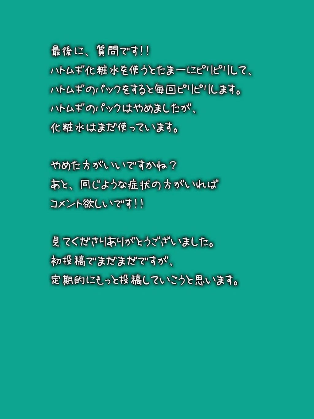 初めまして、コメント失礼します😊! 私もハトムギ化粧水を使うとピリピリする時があります💦 特に肌荒れを起こしている時や、クレンジング中から肌がピリピリするなと感じる時は痛いほどです💦 そういう時はCLINIQUEの化粧水を使ったり、化粧水なしで保湿ジェルを塗っています。 私の場合、毎回はピリピリしない、またピリピリしても目立った肌トラブルが起こらないためハトムギ化粧水が合わないというよりお肌自体が敏感になっているよう感じます。 ですので肌の調子が良い時だけ使うことで、うまく活用出来ているかな〜と思います✨ レモネードさんが続けて使用して大丈夫かどうかは素人ですので意見できませんが、同じ症状の人もいるんだなー😗程度に思ってもらえたら👌