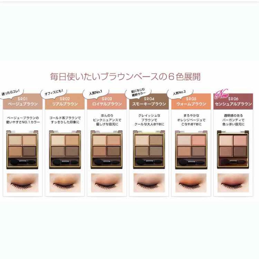- 【ポイント】 1.失敗しらずのブラウンベースの4色パレット!簡単にグラデーションを実現。 2.しっとりリッチな質感!するする伸びて粉飛びもなく目元の乾燥も防ぎます。 3.上品な輝きの繊維パール+金パールを贅沢に配合。ギラつかない大人のツヤを演出。 <SR01'23・SR03'23・SR06'23・SR11'23(限定デザイン)> 実力派グラデアイシャドウからデジタルアートをあしらった限定デザイン登場。 しっとりリッチな密着感。肌のなじみの良い実力派グラデアイシャドウ。