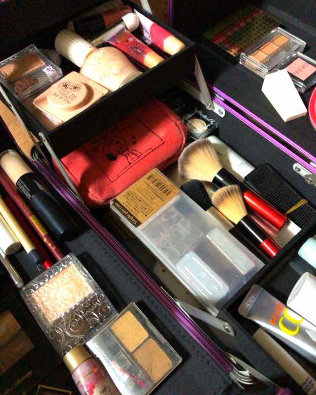 やっと届いたメイクボックス‼︎布団の上でいろいろ詰めてみたら思ったよりたくさん入っていいわ〜ついでにメイクポーチの中身も並べちゃいましたでもちょっとごちゃごちゃ٩(ᐛ)وゴールデンウィークはこれ持って行って、色んなメイクし合って遊ぶ予定w#コ...