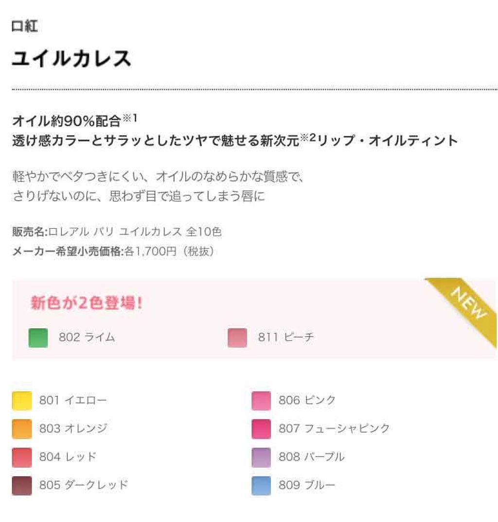 - オイル約90%配合、透け感カラーとサラッとしたツヤで魅せる新次元リップ・オイルティント。 軽やかでベタつきにくい、オイルのなめらかな質感で、さりげないのに、思わず目で追ってしまう唇に。