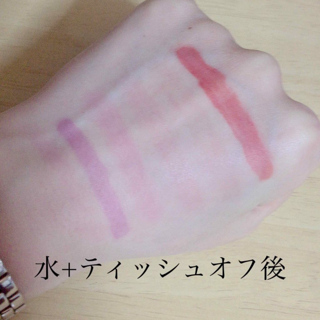 使ってみるととても塗りやすかったです! するっと塗れてみずみずしいのに、唇にぴたっと密着します! 1回ティッシュオフをするとさらに密着し全然色落ちせず、色が残っていました。 唇に塗ってみると馴染みやすいピンクで使いやすかったです!