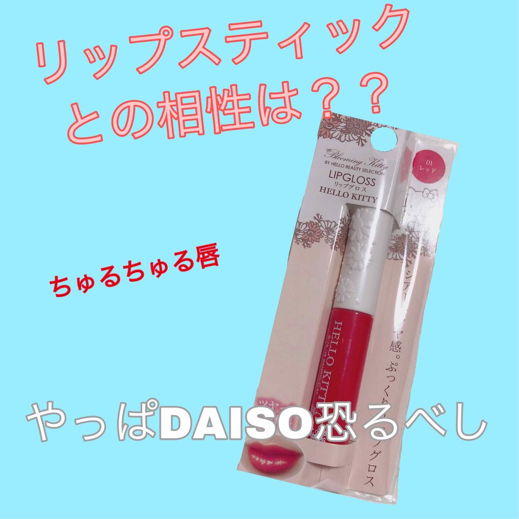 DAISOHELLOKITTYリップグロス01レッドこの商品も中々人気同種類のリップスティックとの相性が気になって購入塗り心地良し,塗った瞬間からうる艶ちゅるんちゅるんな唇にリップグロスの為,ティッシュoffすると落ちるがoffした後も少し潤...