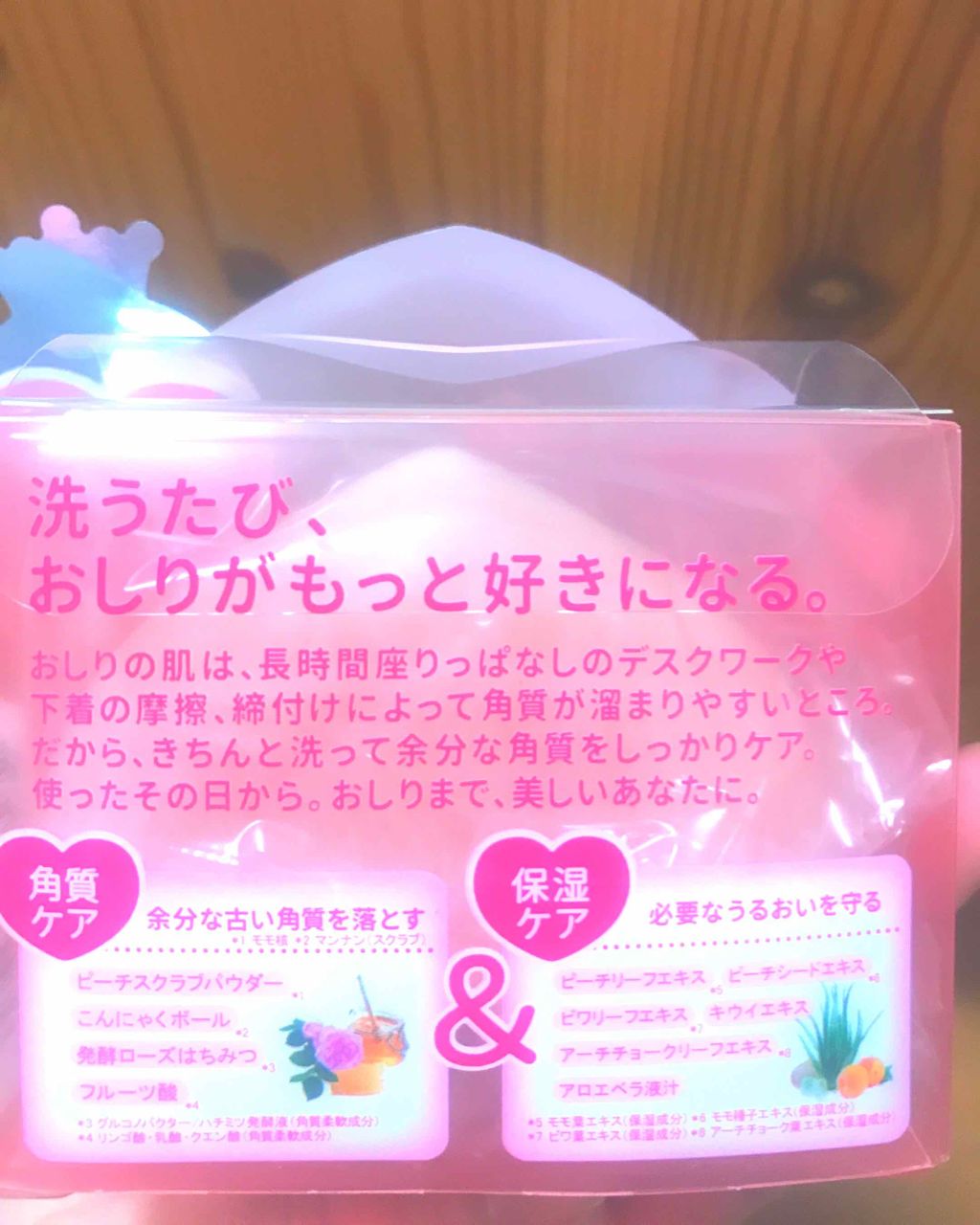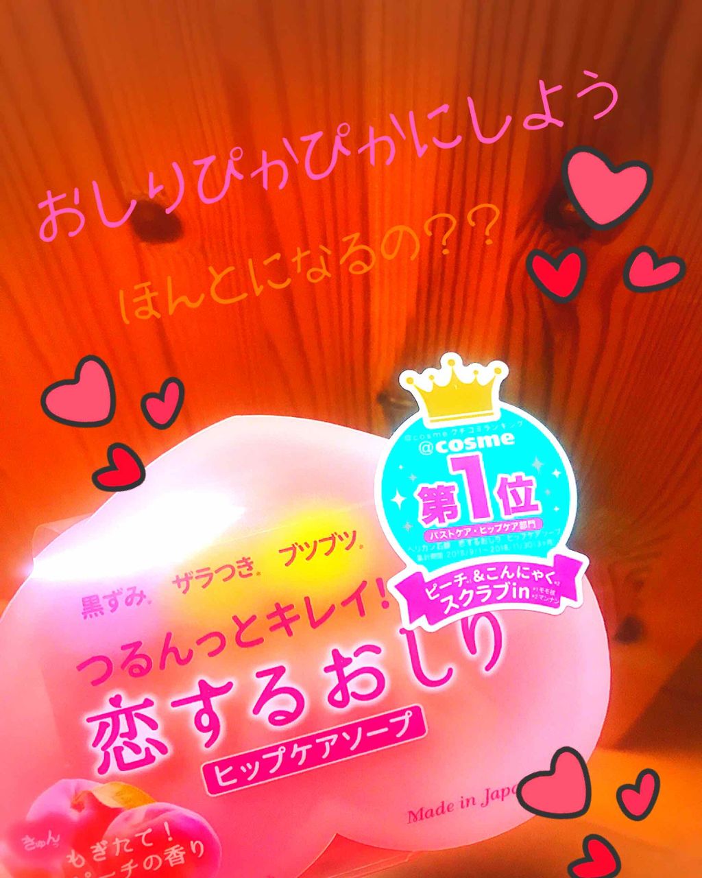 - 恋するおしり ヒップケアソープ おしりの黒ずみ・ザラつき・ブツブツにくるくる直接洗いの簡単ケア! (1)余分な古い角質を落とす:角質ケア スクラブ※1&ピーリング成分※2配合 【モモ核、マンナン※1 グルコノバクター/ハチミツ発酵液、 リンゴ酸・乳酸・クエン酸※2】 (2)必要なうるおいを守る:保湿ケア 6種※3の美容保湿エッセンスを配合 【モモ葉エキス、モモ種子エキス、ビワ葉エキス、キウイエキス、 アーチチョーク葉エキス、アロエベラ液汁※3】 ◎「きゅんっ」とする もぎたて!ピーチの香り