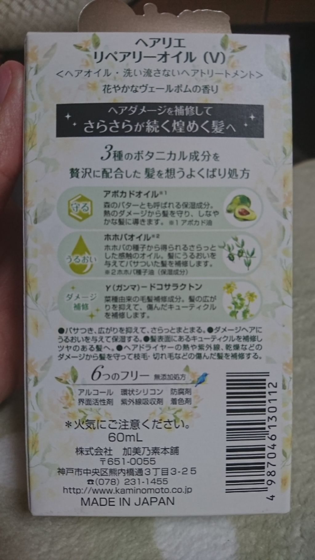 ヘアオイルのイメージが変わる!【#ヘアリエリペアリーオイル】(#株式会社加美乃素本舗)🌱アボカドオイル・ホホバオイル・γードコサラクトンの3種のボタニカル成分を贅沢に配合✨無添加処方で髪の毛をいたわります✨🌱凄くサラサラのオイルで髪の毛に馴染...