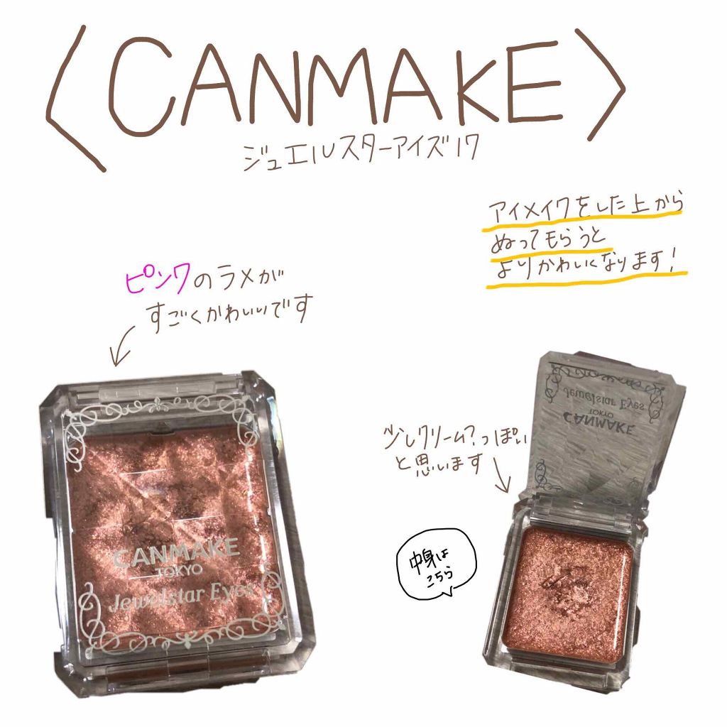 こんにちは!今回はCANMAKEを紹介します💕キャンメイク『ジュエルスターアイズ17』触った感じだと少しクリーム?みたいな感じです。指で塗った方が塗りやすいと思います!アイメイクをした上から塗るとより可愛らしくなりますよ😄...