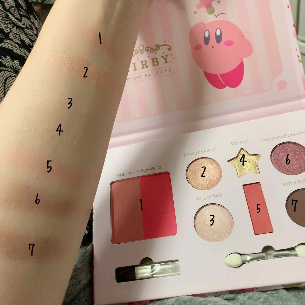 1番コフレ星のカービィA賞プププなコスメパレット2度塗りしてるけど、写真ではわかりにくいなもっともっと発色は良い!1混ぜて使ってみたら、可愛らしいピンクだけど、ちょっとわたしには濃いかな🤔2綺麗な十円玉色2.3.6の順でパール感強い良き3涙袋...