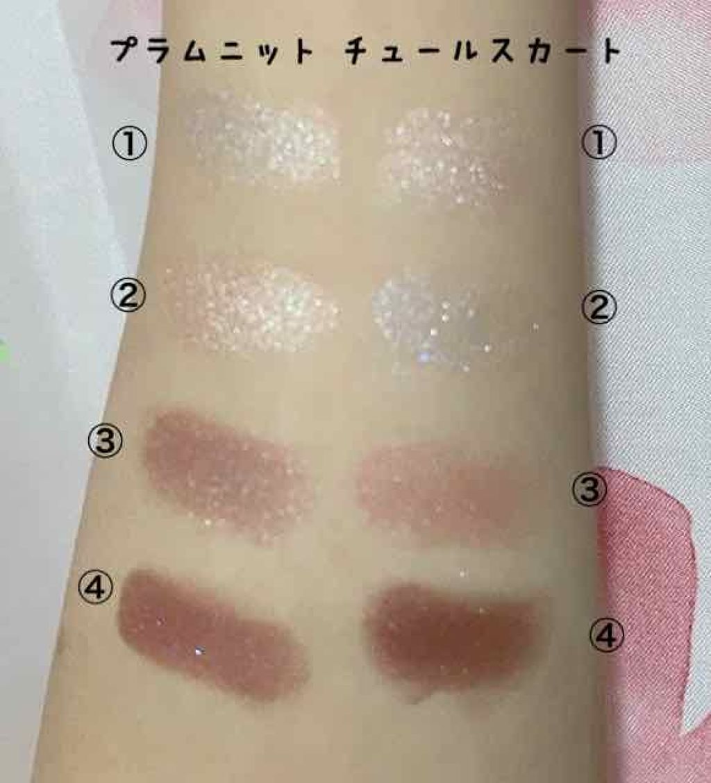 今更ながら愛用してるエクセルのリアルクローズシャドウのプラムニットとチュールスカートの比較です。①左上②右上③左下④右下になってます。チュールスカートがすごくかわいい…!!!でも実際まぶたに乗せるとわたしにはプラムニットの方が似合ってるかなー...