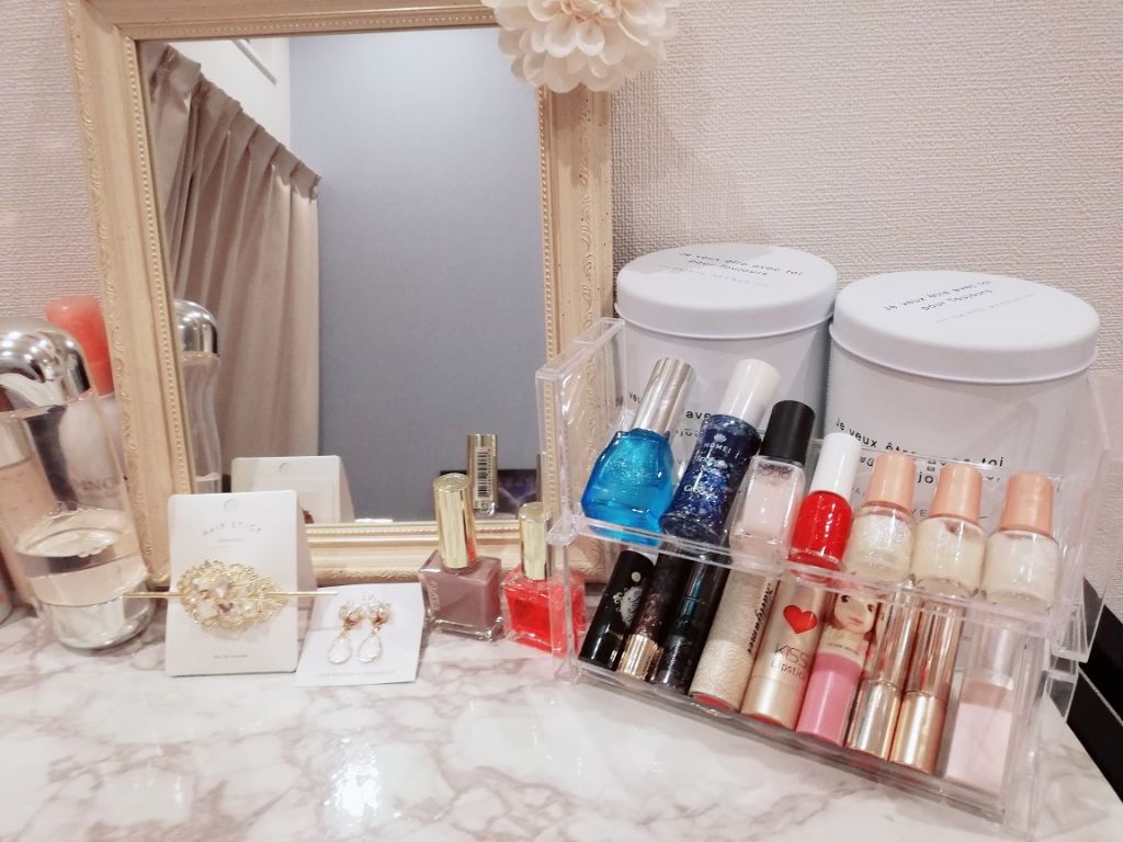 カラーボックスを横に使用。そこに突っ張り棒でカフェカーテンをつけてます。 引き出しは全てDAISOのもの。アイシャドウや普段あまり使わないカラーライナー、カラーマスカラ、下地等を収納。 ディズニーのお菓子のケースです🍭 結構大きくて急いでいるときでもここから取り出してささっとファンデをすませます!