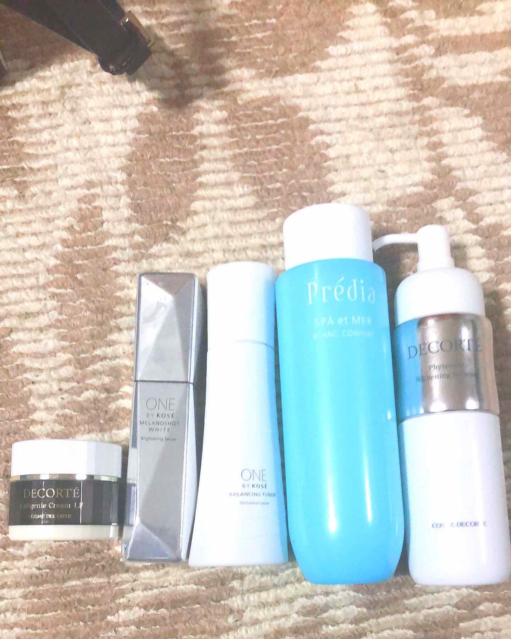 朝用スキンケア('')♡1フォトチューンホワイトニングソフナー2prediaスパ・エ・メールブランコンフォール3ONEBYKOSEバランシングチューナー4ONEBYKOSEメラノショットホワイト5DECORTEセルジェニークリームLFの順番で...