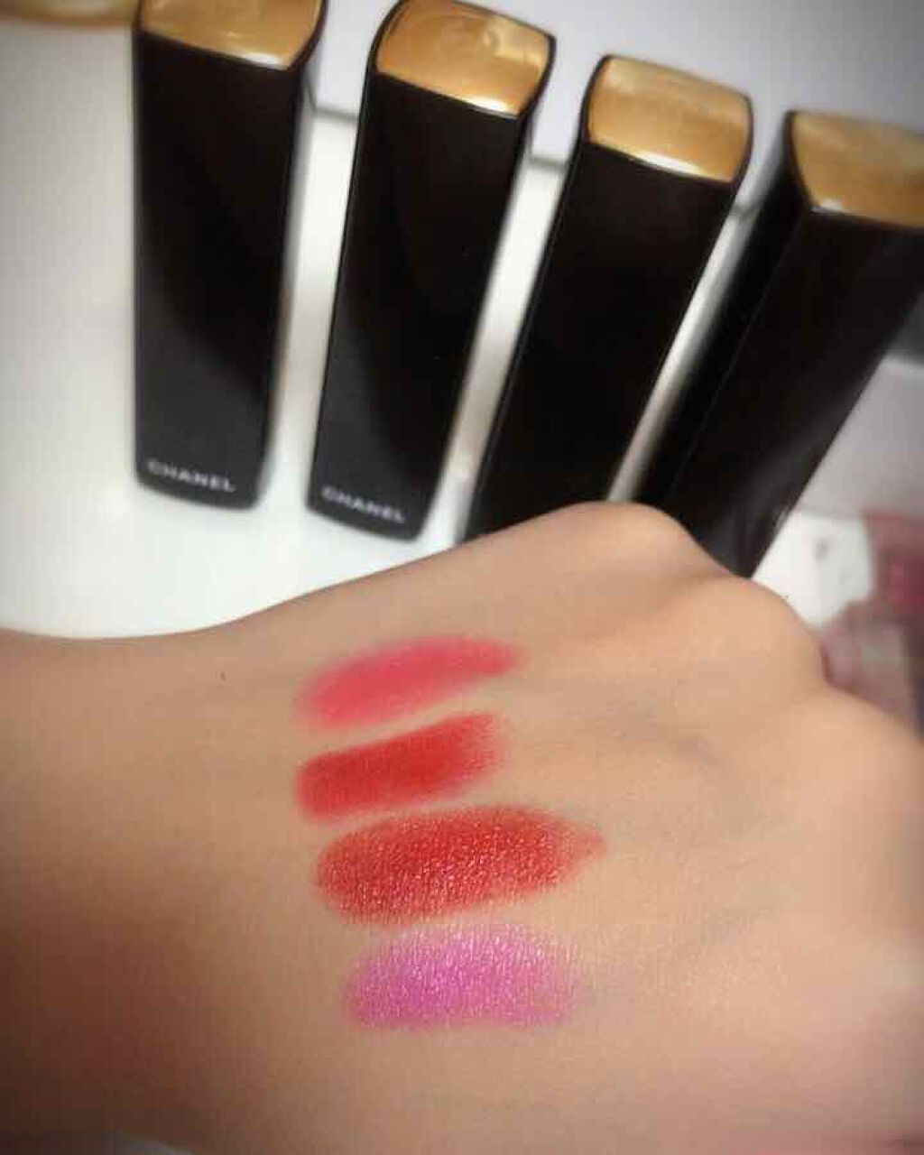 購入品CHANELルージュアリュールインクフュージョン836イディリク購入しました初CHANEL!ルージュアリュールインクフュージョンはリキッドマットリップで、落ちづらく、着け心地が軽いです。836イディリクは少し青みのある赤。でも青すぎない...