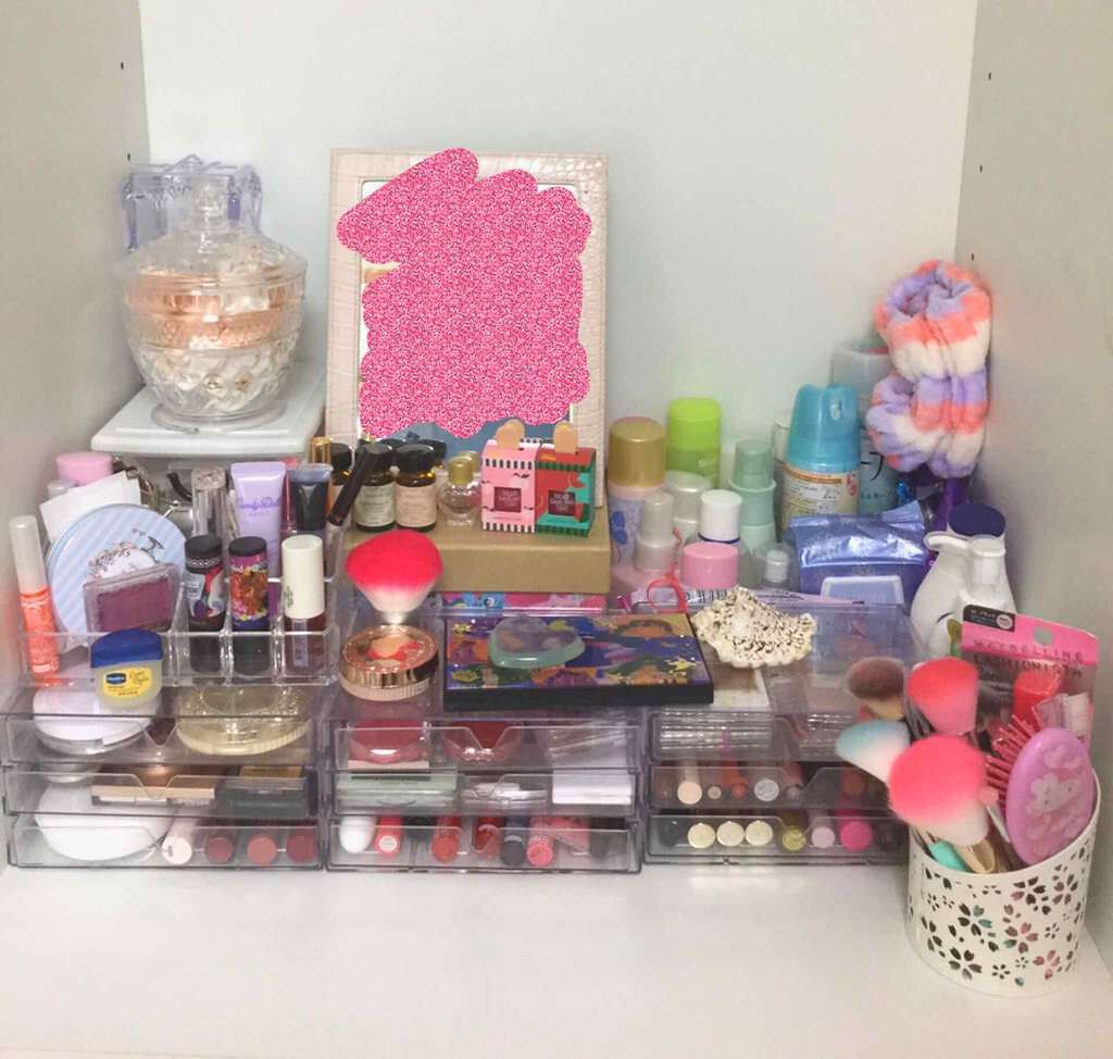【DAISOコスメ収納紹介🤤】全部ダイソーの収納ケースで作ったコスメコーナーです…笑量も少ないしディスプレイの仕方も下手くそですみません…😂一番右の箱には制汗剤やヘアスプレー、スキンケア、メイク落とし、日焼け止めなどがたくさん入ってます☺️🍒...