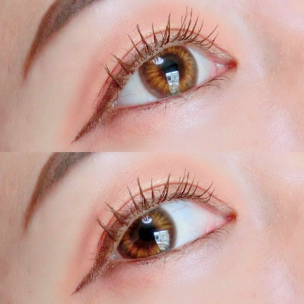思っていたより三日月が目立つ! 目元をアップで撮影した時のかわいさは大満足♡ このデザインはあまりハイライトが目立たないものをこれからは選びたいと思いました。 ドリームブラウンはブラウンの部分がほとんど発色せずほんのり瞳の色が明るくなったかな?くらい。 ピーチクラウズより三日月部分が目立ちました。 瞳がパープルがかって見える効果は感じました◎ 私はブラウンよりこちらの方がデザインとしてバランスがとれていると思う。 ブラウンは黄色くなるからくすみやすくてイエベ向けですがピンクはパーソナルカラー関係なく使える色味です。