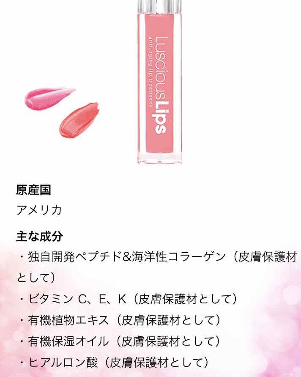 - <321 Are You Red-dy?> ポリブテン、アロエベラエキス、パルミチン酸エチルヘキシル、アボカド油、アンズ核油、ブドウ種子油、ヒマシ油、ホホバ種子油、シリカ、(VP/ヘキサデセン)コポリマー、マイクロクリスタリンワックス、トリ(カプリル酸/カプリン酸)グリセリル、イソヘキサデカン、水、マイカ、グリセリン、BG、酢酸トコフェロール、ステビアエキス、メンタアルベンシスエキス、シュウ酸メンチルエチルアミド、スペアミント油、コラーゲン、アスコルビン酸、ビス(PEG/PPG-14/14)ジメチコン、カルボマー、(エチレン/プロピレン/スチレン)コポリマー、(ブチレン/エチレン/スチレン)コポリマー、ポリソルベート-7、アルゲエキス、シクロペンタシロキサン、ヒアルロン酸Na、キサンタンガム、フェノキシエタノール、トリペプチド-1、トウガラシ果実エキス(他色素等) <322 Twinkle Winkle> ポリブテン、アロエベラエキス、パルミチン酸エチルヘキシル、アボカド油、アンズ核油、ブドウ種子油、ヒマシ油、ホホバ種子油、シリカ、(VP/ヘキサデセン)コポリマー、マイクロクリスタリンワックス、トリ(カプリル酸/カプリン酸)グリセリル、イソヘキサデカン、水、マイカ、グリセリン、BG、酢酸トコフェロール、ステビアエキス、メンタアルベンシスエキス、シュウ酸メンチルエチルアミド、スペアミント油、コラーゲン、アスコルビン酸、ビス(PEG/PPG-14/14)ジメチコン、カルボマー、(エチレン/プロピレン/スチレン)コポリマー、(ブチレン/エチレン/スチレン)コポリマー、ポリソルベート-7、アルゲエキス、シクロペンタシロキサン、ヒアルロン酸Na、キサンタンガム、フェノキシエタノール、トリペプチド-1、トウガラシ果実エキス(他色素等) <323 Blonze Goddess> ポリブテン、アロエベラエキス、パルミチン酸エチルヘキシル、アボカド油、アンズ核油、ブドウ種子油、ヒマシ油、ホホバ種子油、シリカ、(VP/ヘキサデセン)コポリマー、マイクロクリスタリンワックス、トリ(カプリル酸/カプリン酸)グリセリル、イソヘキサデカン、水、マイカ、グリセリン、BG、酢酸トコフェロール、ステビアエキス、メンタアルベンシスエキス、シュウ酸メンチルエチルアミド、スペアミント油、コラーゲン、アスコルビン酸、ビス(PEG/PPG-14/14)ジメチコン、カルボマー、(エチレン/プロピレン/スチレン)コポリマー、(ブチレン/エチレン/スチレン)コポリマー、ポリソルベート-7、アルゲエキス、シクロペンタシロキサン、ヒアルロン酸Na、キサンタンガム、フェノキシエタノール、トリペプチド-1、トウガラシ果実エキス(他色素等) <324 Yummy Plummy> ポリブテン、アロエベラエキス、パルミチン酸エチルヘキシル、アボカド油、アンズ核油、ブドウ種子油、ヒマシ油、ホホバ種子油、シリカ、(VP/ヘキサデセン)コポリマー、マイクロクリスタリンワックス、トリ(カプリル酸/カプリン酸)グリセリル、イソヘキサデカン、水、マイカ、グリセリン、BG、酢酸トコフェロール、ステビアエキス、メンタアルベンシスエキス、シュウ酸メンチルエチルアミド、スペアミント油、コラーゲン、アスコルビン酸、ビス(PEG/PPG-14/14)ジメチコン、カルボマー、(エチレン/プロピレン/スチレン)コポリマー、(ブチレン/エチレン/スチレン)コポリマー、ポリソルベート-7、アルゲエキス、シクロペンタシロキサン、ヒアルロン酸Na、キサンタンガム、フェノキシエタノール、トリペプチド-1、トウガラシ果実エキス(他色素等) <325 Petal Rebel> ポリブテン、アロエベラエキス、パルミチン酸エチルヘキシル、アボカド油、アンズ核油、ブドウ種子油、ヒマシ油、ホホバ種子油、シリカ、(VP/ヘキサデセン)コポリマー、マイクロクリスタリンワックス、トリ(カプリル酸/カプリン酸)グリセリル、イソヘキサデカン、水、マイカ、グリセリン、BG、酢酸トコフェロール、ステビアエキス、メンタアルベンシスエキス、シュウ酸メンチルエチルアミド、スペアミント油、コラーゲン、アスコルビン酸、ビス(PEG/PPG-14/14)ジメチコン、カルボマー、(エチレン/プロピレン/スチレン)コポリマー、(ブチレン/エチレン/スチレン)コポリマー、ポリソルベート-7、アルゲエキス、シクロペンタシロキサン、ヒアルロン酸Na、キサンタンガム、フェノキシエタノール、トリペプチド-1、トウガラシ果実エキス(他色素等) <326 Main Attraction> ポリブテン、アロエベラエキス、パルミチン酸エチルヘキシル、アボカド油、アンズ核油、ブドウ種子油、ヒマシ油、ホホバ種子油、シリカ、(VP/ヘキサデセン)コポリマー、マイクロクリスタリンワックス、トリ(カプリル酸/カプリン酸)グリセリル、イソヘキサデカン、水、マイカ、グリセリン、BG、酢酸トコフェロール、ステビアエキス、メンタアルベンシスエキス、シュウ酸メンチルエチルアミド、スペアミント油、コラーゲン、アスコルビン酸、ビス(PEG/PPG-14/14)ジメチコン、カルボマー、(エチレン/プロピレン/スチレン)コポリマー、(ブチレン/エチレン/スチレン)コポリマー、ポリソルベート-
