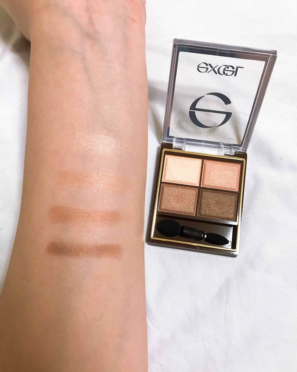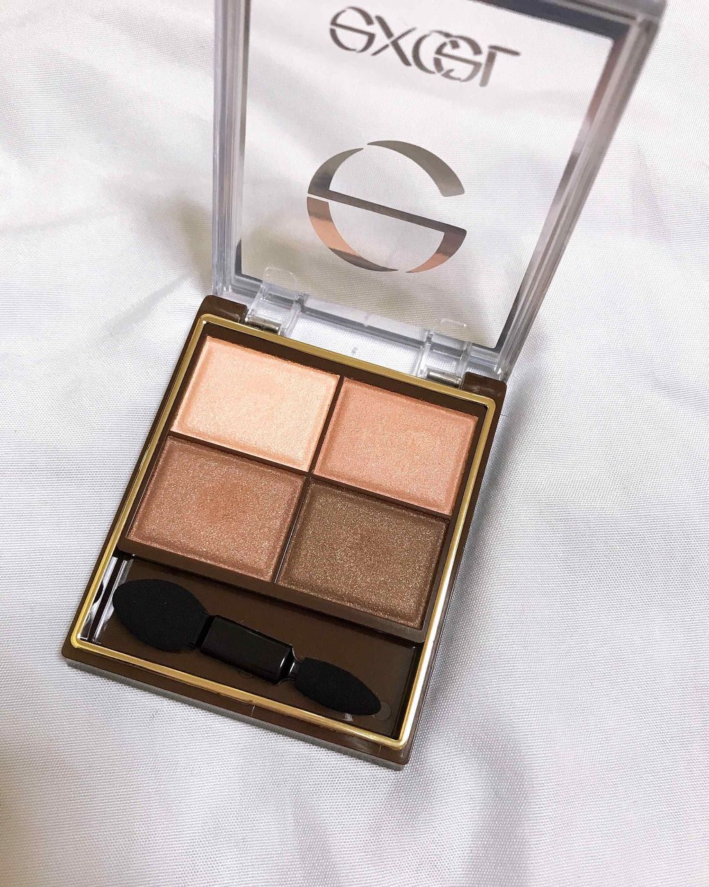 excelのスキニーリッチシャドウ可愛すぎるー🩷️ 何回もメイクに使いよる😂 右側の淡い色を重ねて、二重幅に濃いブラウンを重ねていきました(ღ✪v✪) お上品なキラキラ具合✨ こちらは、大好きな大好きな#gaho ちゃんにいただきました🎁