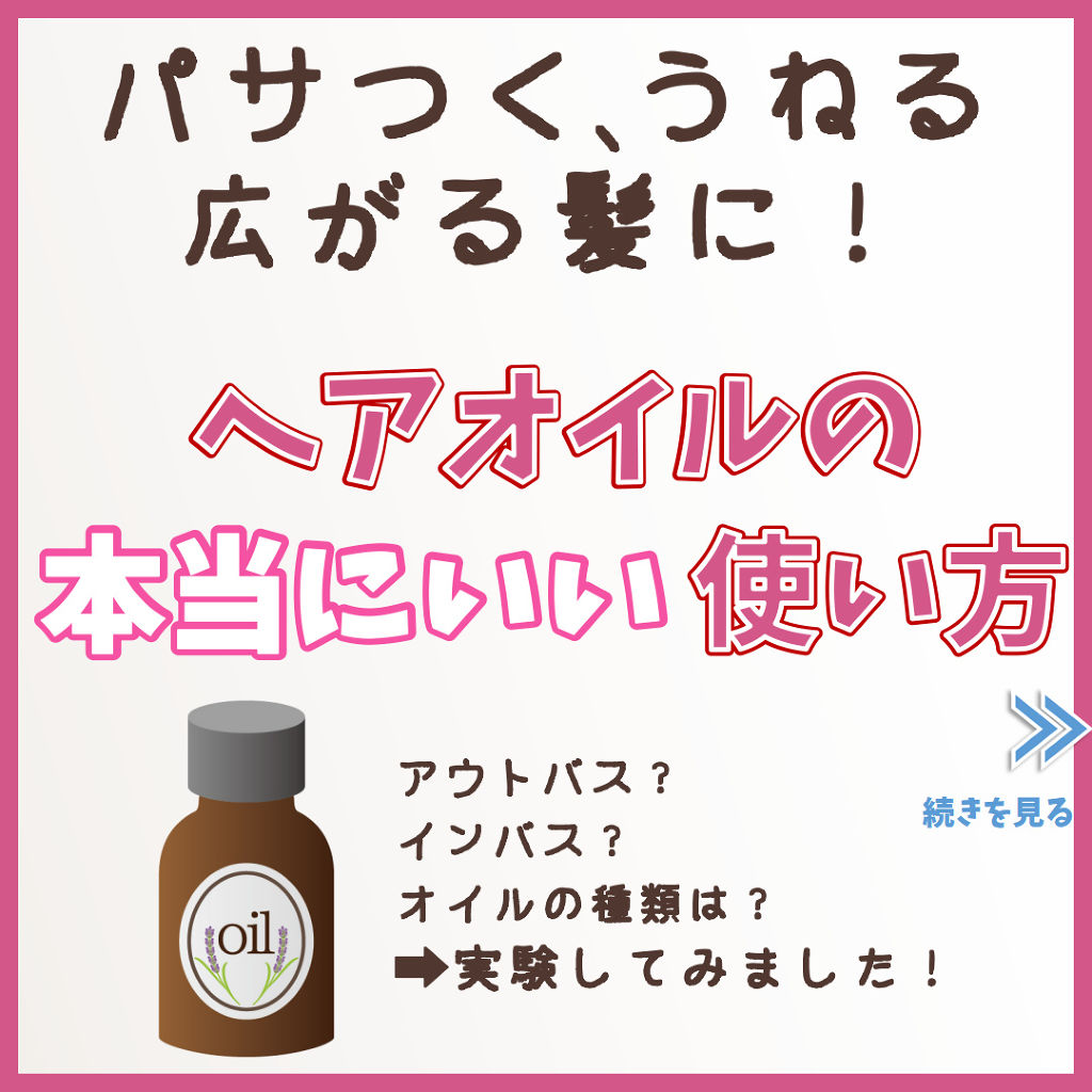 ヘアオイルが一番効果を発揮する使い方を実験してみました。結果は、シャンプー直後にインバスでヘアオイルを付けるのがいいです!トリートメントで髪をコーティングしていると、オイルの髪質改善効果はほとんどありませんでした。使うオイルはシリコーンオイル...