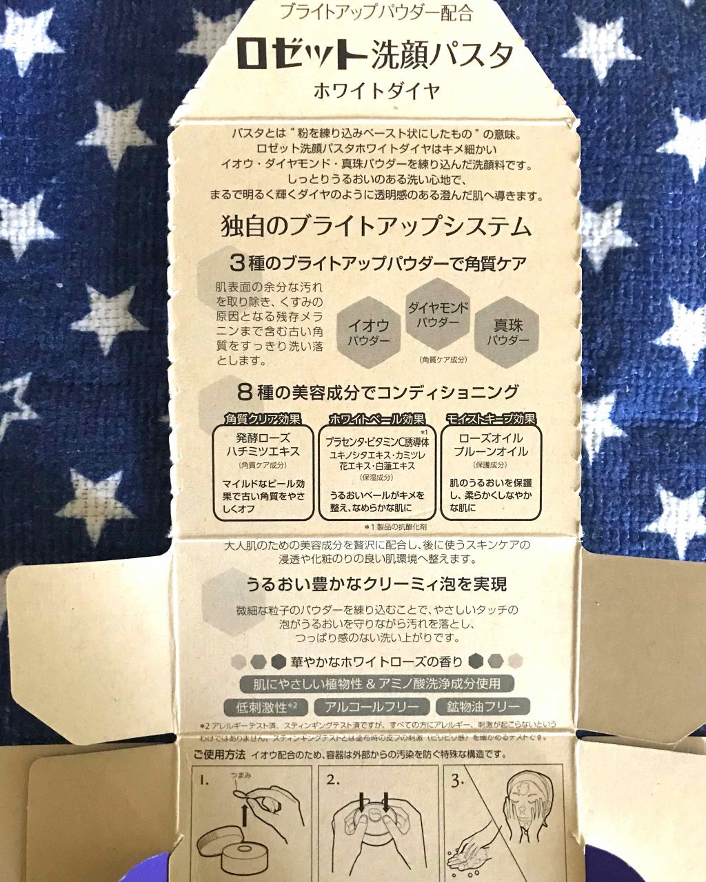 - <ロゼット洗顔パスタ ホワイトダイヤ> 水、ミリスチン酸、ステアリン酸、グリセリン、パルミチン酸、水酸化K、ジグリセリン、ラウリン酸、ラウラミドDEA、メチルグルセス-10、コカミドプロピルベタイン、ラウロイルメチルタウリンNa、イオウ、ダイヤモンド末、パール、グルコノバクター/ハチミツ発酵液、プラセンタエキス、アスコルビン酸硫酸2Na、ユキノシタエキス、カミツレ花エキス、乳酸桿菌/ハス種子発酵液、ダマスクバラ花油、プルーン種子油、BG、コレステロール、ヤシ脂肪酸K、ココイルグリシンK、ステアリン酸PEG-45、セテス-25、トリセテス-5リン酸、ステアリン酸グリセリル(SE)、ヒドロキシプロピルデンプン、(ジフェニルジメチコン/ビニルジフェニルジメチコン/シルセスキオキサン)クロスポリマー、亜硫酸Na、EDTA-4Na、香料