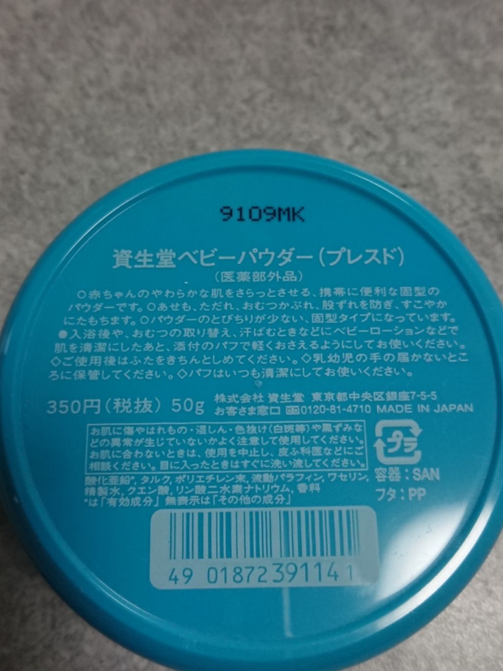 - <50g> 酸化亜鉛、タルク、香料、ワセリン、クエン酸、精製水、流動パラフィン、リン酸二水素ナトリウム、ポリエチレン末