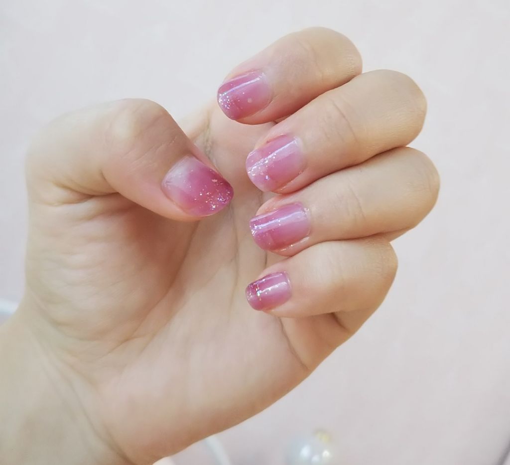 ダイソーのライトピンクはムラになりにくく、もし上手く行かなくても上からラメを重ねるのでセルフジェル初心者さんにもおすすめです!✨ 特にブルベさんにおすすめです! セリアのグリッタージェルもラメがザクザク入っていて、キラキラ輝いて可愛い🤍