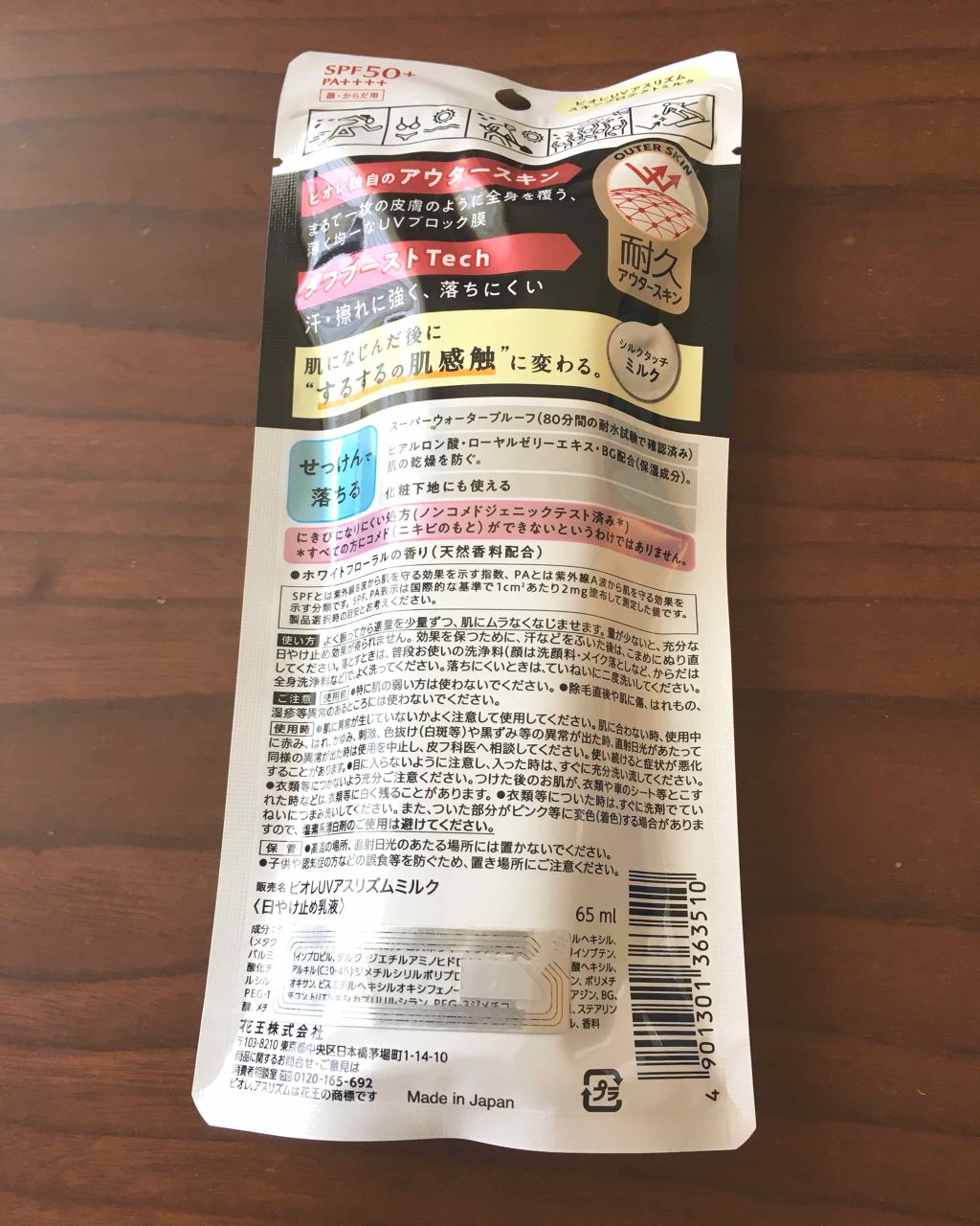 - <ビオレUV アスリズム スキンプロテクトミルク> 酸化亜鉛、水、酸化チタン、BG、ジメチコン、ヒアルロン酸Na、フェノキシエタノール、タルク、香料、水酸化Al、メチコン、エタノール、ローヤルゼリーエキス、メトキシケイヒ酸エチルヘキシル、ステアリン酸、ポリメチルシルセスキオキサン、トリエトキシカプリリルシラン、シクロペンタシロキサン、水添ポリイソブテン、パルミチン酸イソプロピル、ビスエチルヘキシルオキシフェノールメトキシフェニルトリアジン、PEG-12ジメチコン、BHT、ジエチルアミノヒドロキシベンゾイル安息香酸ヘキシル、(メタクリル酸ラウリル/メタクリル酸Na)クロスポリマー、PEG-3ジメチコン、アルキル(C30-45)ジメチルシリルポリプロピルシルセスキオキサン