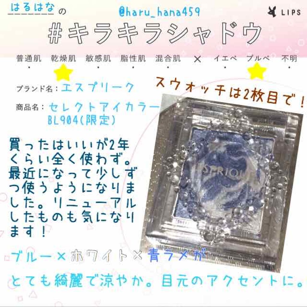 ESPRIQUEセレクトアイカラーNBL900セレクトアイカラーは天然ダイヤモンドを砕いたダイヤモンドパウダーと真珠を砕いた真珠パウダー配合上品なツヤと煌めきをプラスBL900は落ち着いたプラチナブルー写真だとシルバーっぽく見えるけど青味のパ...