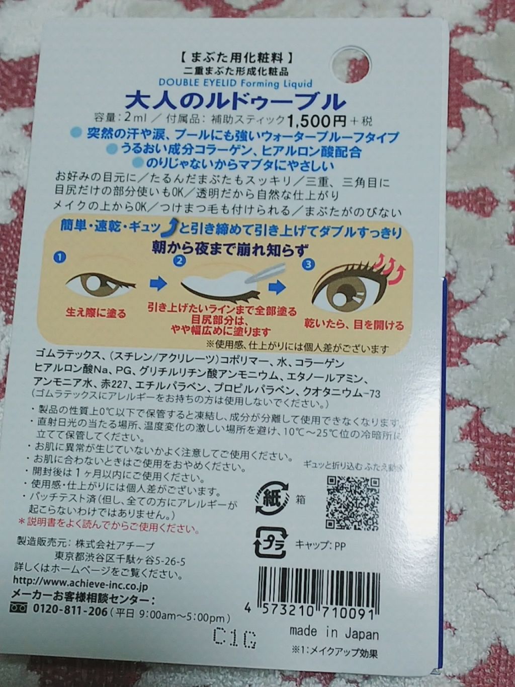 - ★簡単・速乾・ギュッと折り込む二重★ ①生え際に塗る。 ②二重にしたいラインまで全部塗る。 ③乾いたら、目を開ける。 製品の性質上0℃以下で保管すると凍結し、成分が分離して使用できなくなります。直射日光の当たる場所、温度変化の激しい場所を避け、10℃~25℃位の冷暗所に立てて保管してください。ゴムラテックスにアレルギーをお持ちの方は使用しないでください。