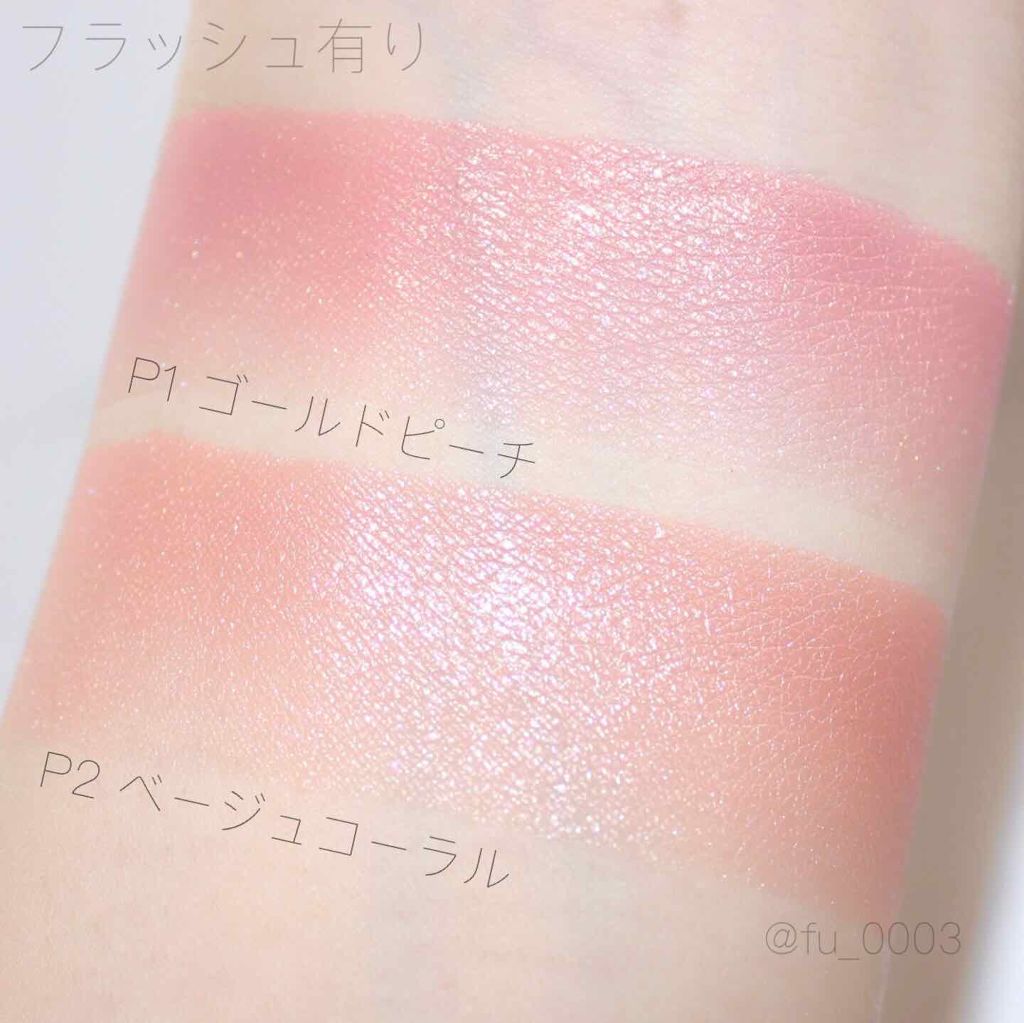 - <P1 ゴールドピーチ> トリイソステアリン酸ポリグリセリル-2、トリエチルヘキサノイン、(フッ化/水酸化/酸化)/(Mg/K/ケイ素)、ヘキサ(ヒドロキシステアリン酸/ステアリン酸/ロジン酸)ジペンタエリスリチル、ミリスチン酸亜鉛、リンゴ酸ジイソステアリル、(HDI/トリメチロールヘキシルラクトン)クロスポリマー、ペンチレングリコール、ビスジグリセリルポリアシルアジペート-2、フェノキシエタノール、ハイドロゲンジメチコン、メチルパラベン、シリカ、トコフェロール、カニナバラ果実油、スクワラン、ホホバ種子油、タルク、マイカ、合成フルオロフロゴパイト、酸化チタン、酸化鉄、赤202、黄4、酸化スズ、赤226、水酸化Al <P2 ベージュコーラル> トリイソステアリン酸ポリグリセリル-2、トリエチルヘキサノイン、(フッ化/水酸化/酸化)/(Mg/K/ケイ素)、ヘキサ(ヒドロキシステアリン酸/ステアリン酸/ロジン酸)ジペンタエリスリチル、ミリスチン酸亜鉛、リンゴ酸ジイソステアリル、(HDI/トリメチロールヘキシルラクトン)クロスポリマー、ペンチレングリコール、ビスジグリセリルポリアシルアジペート-2、フェノキシエタノール、ハイドロゲンジメチコン、メチルパラベン、シリカ、トコフェロール、カニナバラ果実油、スクワラン、ホホバ種子油、タルク、マイカ、合成フルオロフロゴパイト、酸化チタン、酸化鉄、酸化スズ、赤202、赤226、水酸化Al <P3 シナモンオレンジ> トリイソステアリン酸ポリグリセリル-2、トリエチルヘキサノイン、(フッ化/水酸化/酸化)/(Mg/K/ケイ素)、ヘキサ(ヒドロキシステアリン酸/ステアリン酸/ロジン酸)ジペンタエリスリチル、ミリスチン酸亜鉛、リンゴ酸ジイソステアリル、(HDI/トリメチロールヘキシルラクトン)クロスポリマー、ペンチレングリコール、ビスジグリセリルポリアシルアジペート-2、フェノキシエタノール、ハイドロゲンジメチコン、メチルパラベン、シリカ、トコフェロール、カニナバラ果実油、スクワラン、ホホバ種子油、タルク、合成フルオロフロゴパイト、マイカ、酸化チタン、酸化鉄、グンジョウ、酸化スズ、赤226、赤202、水酸化Al