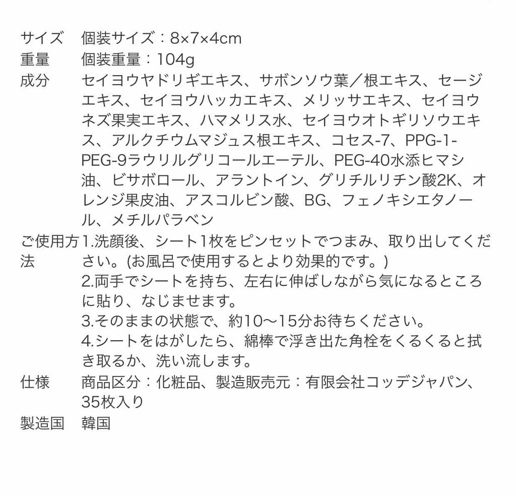- - 鼻・Tゾーン・Uゾーンなど、皮脂の分泌が多い部分や角栓が気になる部分に使用可能 - 肌に負担をかけず、角栓や古い角質を柔らかくして優しく除去 - 毛穴ケアに必要な集中スペシャルケア 「毛穴シート」 は、毛穴の奥に詰まった角栓や古い角質を効果的に除去し、すっきりとした明るくなめらかな小鼻へと導くスペシャルケアアイテムである。定期的に使用することで、よりクリアな肌を維持できる。