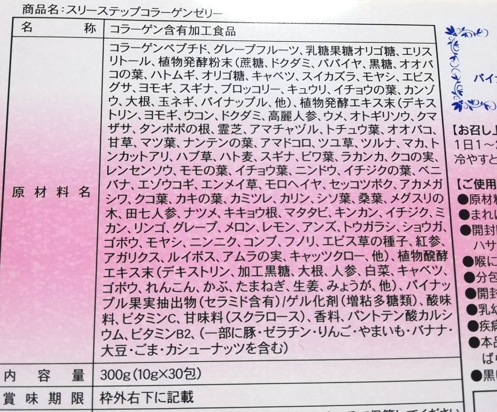 - コラーゲンペプチド、グレープフルーツ、乳糖果糖オリゴ糖、エリスリトール、植物発酵粉末(蔗糖、ドクダミ、パパイヤ、黒糖、オオバコの葉、ハトムギ、オリゴ糖、キャベツ、スイカズラ、モヤシ、エビスグサ、ヨモギ、スギナ、ブロッコリー、キュウリ、イチョウの葉、カンゾウ、大根、玉ネギ、パイナップル、他)、植物発酵エキス末(デキストリン、ヨモギ、ウコン、ドクダミ、高麗人参、ウメ、オトギリソウ、クマザサ、タンポポの根、霊芝、アマチャヅル、トチュウ葉、オオバコ、甘草、マツ葉、ナンテンの葉、アマドコロ、ツユ草、ツルナ、マカ、トンカットアリ、ハブ草、ハト麦、スギナ、ビワ葉、ラカンカ、クコの実、レンセンソウ、モモの葉、イチョウ葉、ニンドウ、イチジクの葉、ベニバナ、エゾウコギ、エンメイ草、モロヘイヤ、セッコツボク、アカメガシワ、クコ葉、カキの葉、カミツレ、カリン、シソ葉、桑葉、メグスリの木、田七人参、ナツメ、キキョウ根、マタタビ、キンカン、イチジク、ミカン、リンゴ、グレープ、メロン、レモン、アンズ、トウガラシ、ショウガ、ゴボウ、モヤシ、ニンニク他)、植物醗酵エキス末(デキストリン、加工黒糖、大根、人参、白菜、キャベツ、ゴボウ、れんこん、かぶ、たまねぎ、生姜、みょうが、他)、パイナップル果実抽出物(セラミド含有)/ゲル化剤(増粘多糖類)、酸味料、ビタミンC、甘味料(スクラロース)、香料、パントテン酸カルシウム、ビタミンB2、(一部に豚・ゼラチン・りんご・やまいも・バナナ・大豆・ごま・カシューナッツを含む)