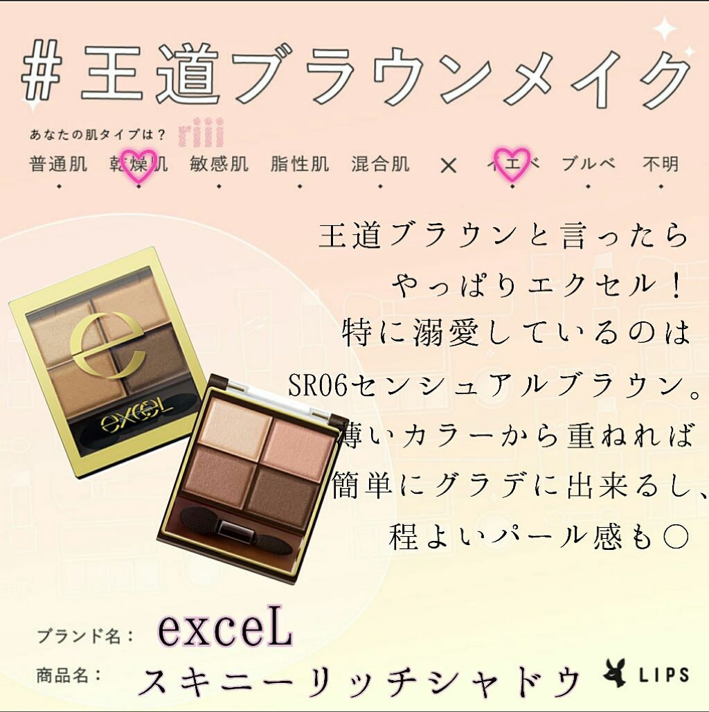 excelスキニーリッチシャドウSR06センシュアルブラウン📷3枚目にスウォッチあり⋱⋰⋱⋰⋱⋰⋱⋰⋱⋰⋱⋰⋱⋰⋱⋰⋱⋰⋱⋰手持ちのアイシャドウはほとんどピンク系なのですが、たまーにブラウンのシャドウを使うとなるとexcelのスキニーリッチシ...
