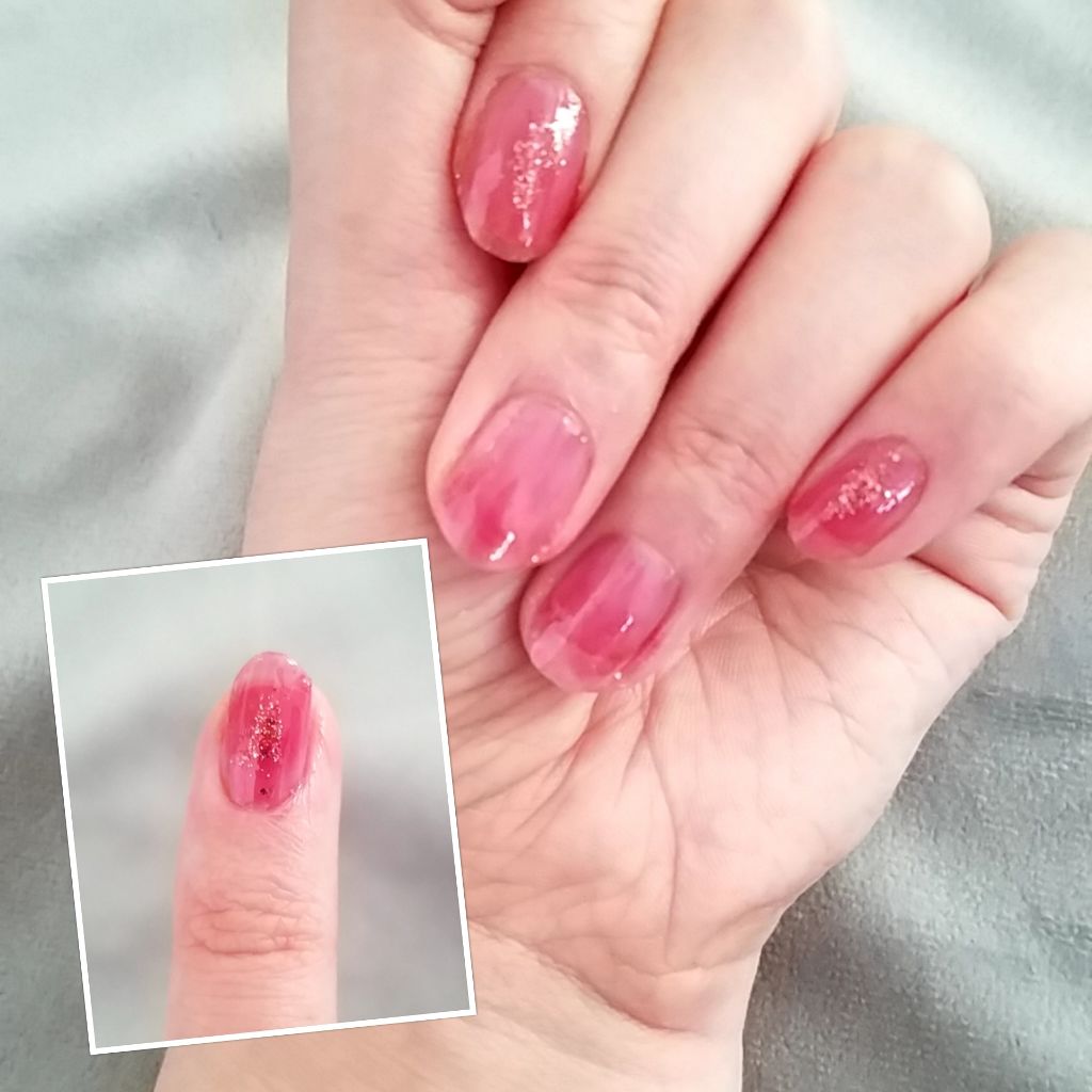 100均のマニキュア4本で作る透明感ネイル親指はチークネイルに白いマニキュアでハートそれ以外はシロップの薄い赤と青を2回ずつまだらに塗って最後に全ての爪にキラキラのマニキュアでトップコート代わりにチークネイルが難しくて大きい丸から小さく重ねて...