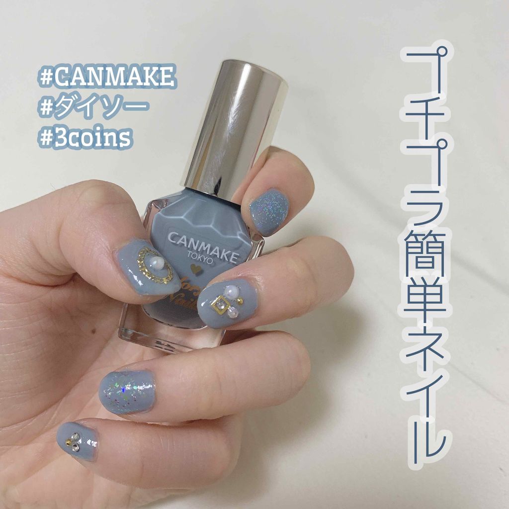 プチプラネイル!!#CANMAKE#ダイソー#3coinsで売っているもので初心者ながらネイルしてみました☺︎ベースはCANMAKEの#カラフルネイルズN8番です。そこに3coinsで購入した#MCピールオフラメマニキュアを塗り重ねたり、ダイ...