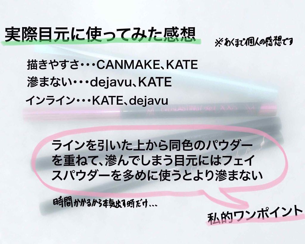持っている4種類のペンシルアイライナーを比べてみました✨・CANMAKEクリーミータッチアイライナー・KATEレアフィットジェルペンシル・MAYBELLINEEVラスティングジェルライナー・dejavuラスティファインクリームペンシル描きやす...