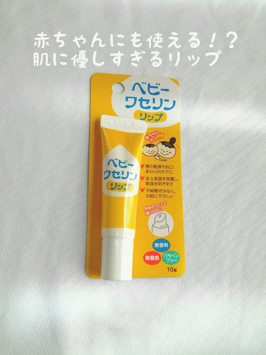 - 子供から大人まで安心&手軽に使える「ベビーワセリンリップ」 ベビーワセリンは、酸処理を伴わない精製方法を採用しており無香料、無着色、パラベンフリーの商品です。従来のワセリンと比べ、無添加で不純物が少なく、やわらかくて伸びがよいため赤ちゃんから大人まで安心してご利用頂けます。本商品は、チューブタイプで先端が斜めにカットされているため、リップとして便利なタイプです。